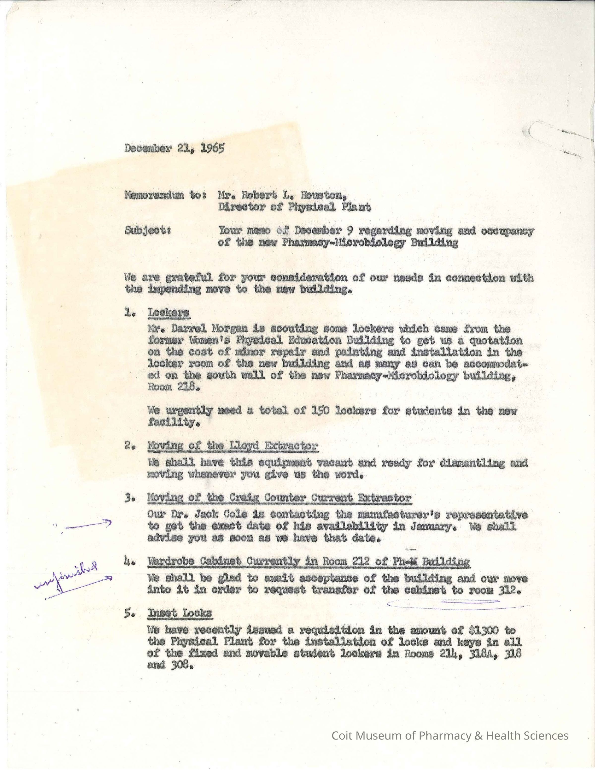 Memo to University of Arizona Physical Plant Director Robert Houston from W.R. Brewer addressing aspects of the new Pharmacy-Microbiology building. Attached is Houston's memo, dated 12/09/1965 to which this letter is responding. Memo contains hand written marginalia by someone from the College of Pharmacy.