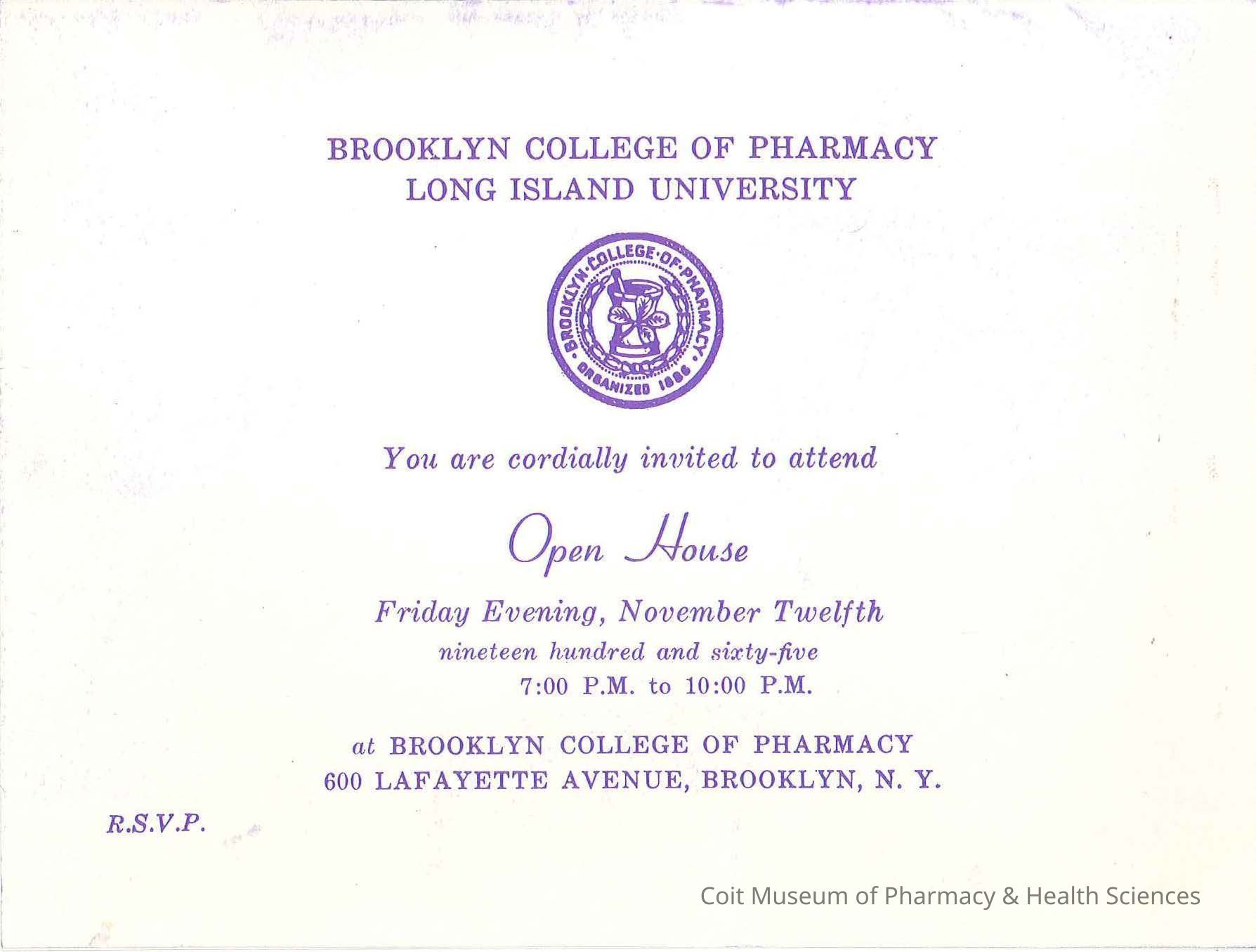 Invitation to attend an open house at the Brooklyn College of Pharmacy at Long Island University.