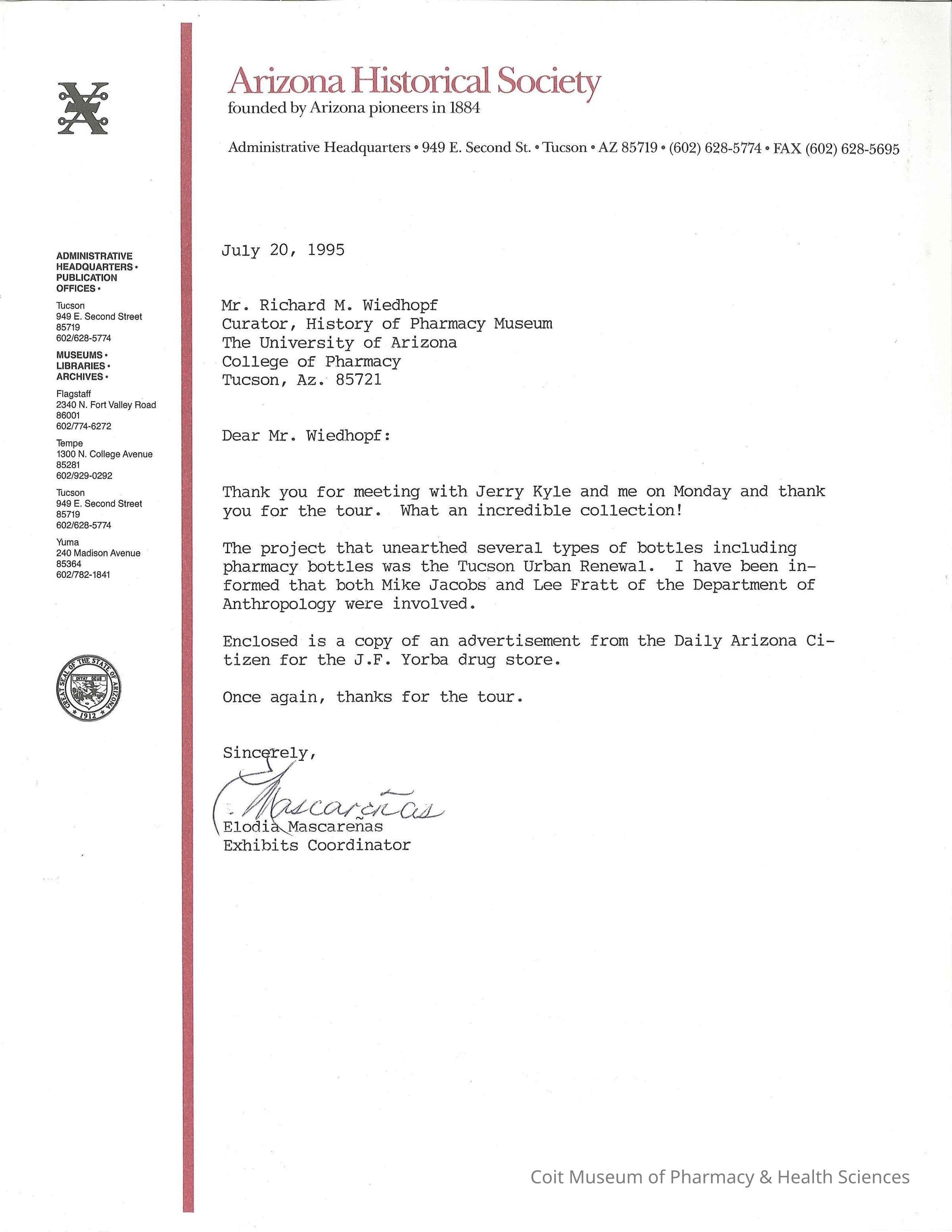Note from Elodia Mascarenas of the Arizona Historical Society to Richard Wiedhoph thanking him for the tour of the University of Arizona History of Pharmacy Museum.