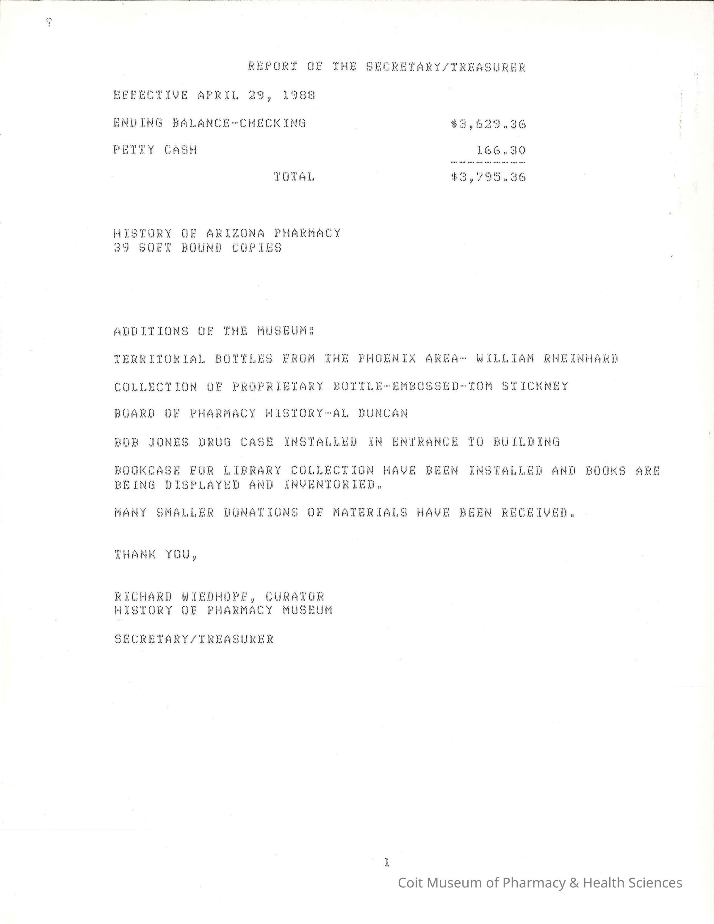 Report of the Arizona Pharmacy Historical Foundation secretary/treasurer Richard Wiedhopf concerning finances and the University of Arizona History of Pharmacy Museum.