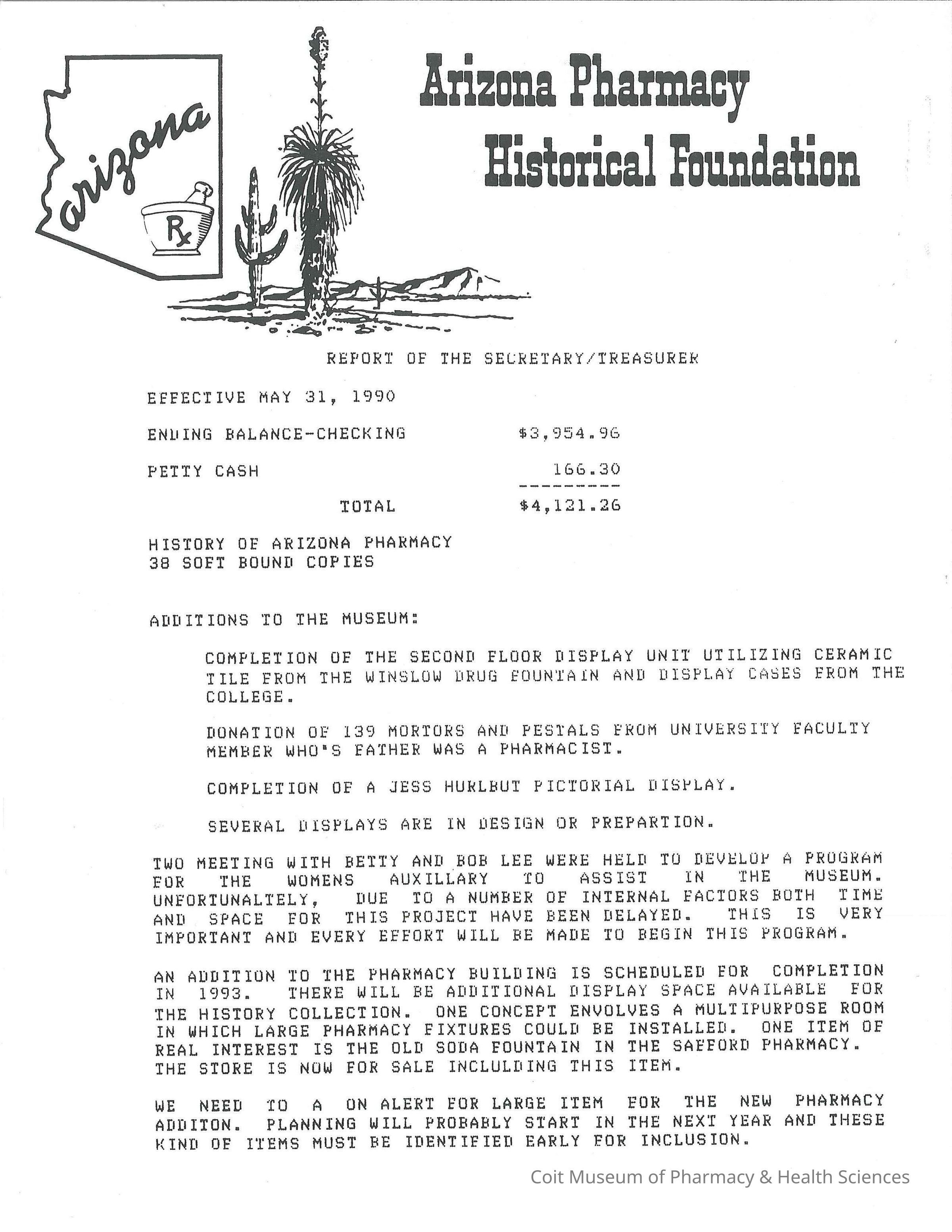 Report of the Arizona Pharmacy Historical Foundation secretary/treasurer Richard Wiedhopf concerning finances and the University of Arizona History of Pharmacy Museum.
