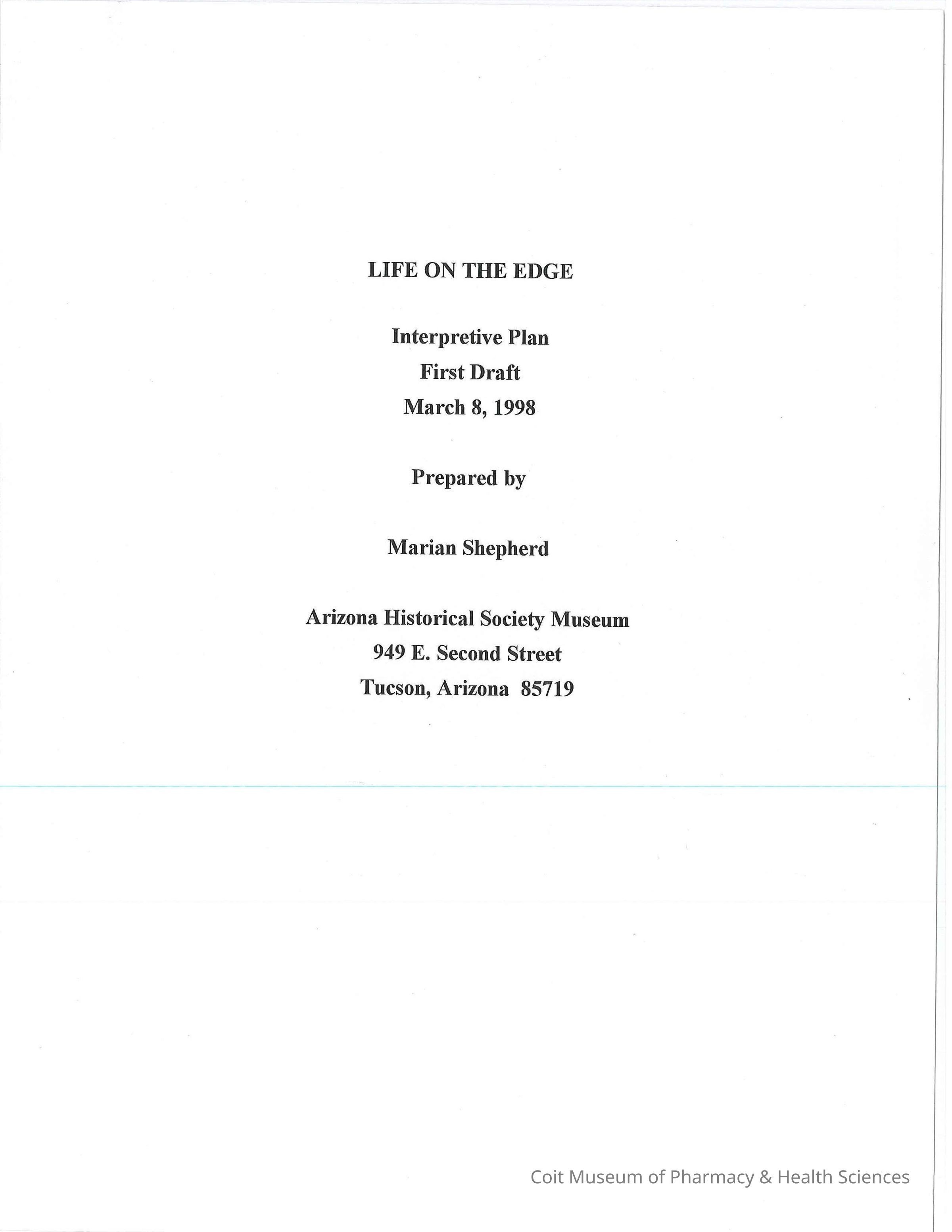 Draft of the interpretive plan for "Life on the Edge" a history of medicine in Southern Arizona prepared by Marian Shepherd for the Arizona Historical Society Museum.Collection