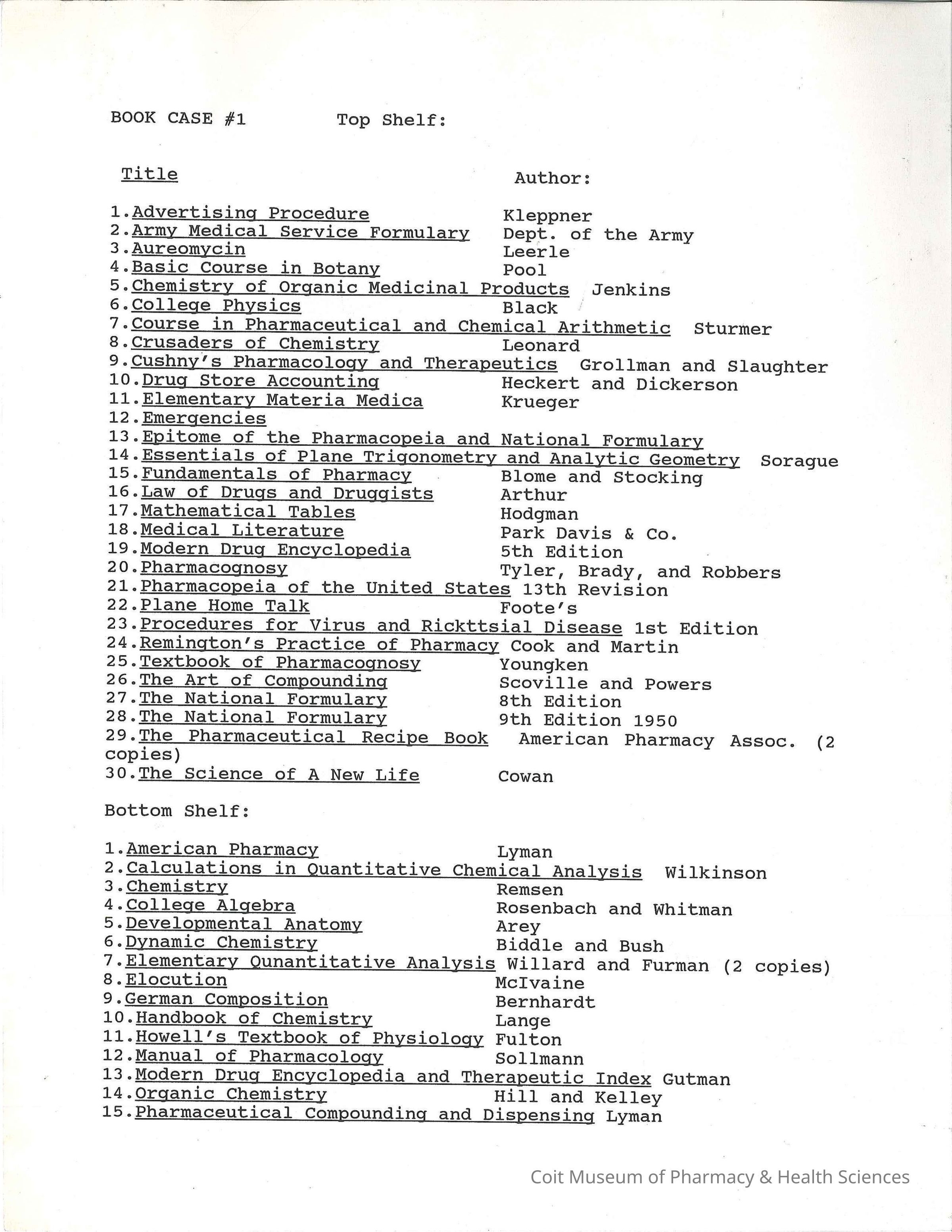 List of the contents of bookcases from the University of Arizona History of Pharmacy Musuem.