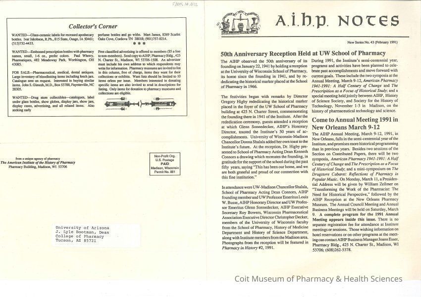 American Institute of the History of Pharmacy's AIHP Notes newsletter, no. 43, February 1991.