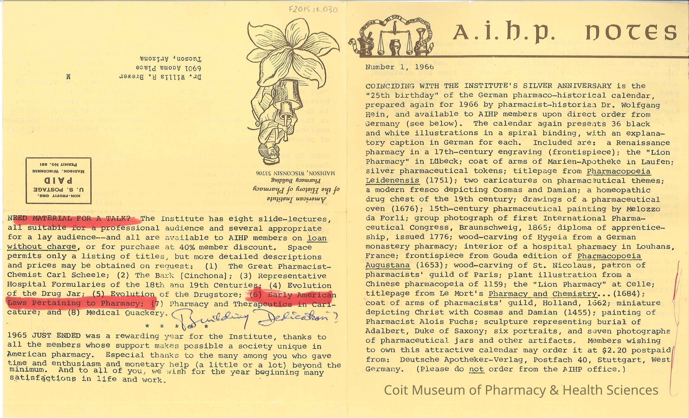 American Institute of the History of Pharmacy's AIHP Notes newsletter, no. 1, 1966.