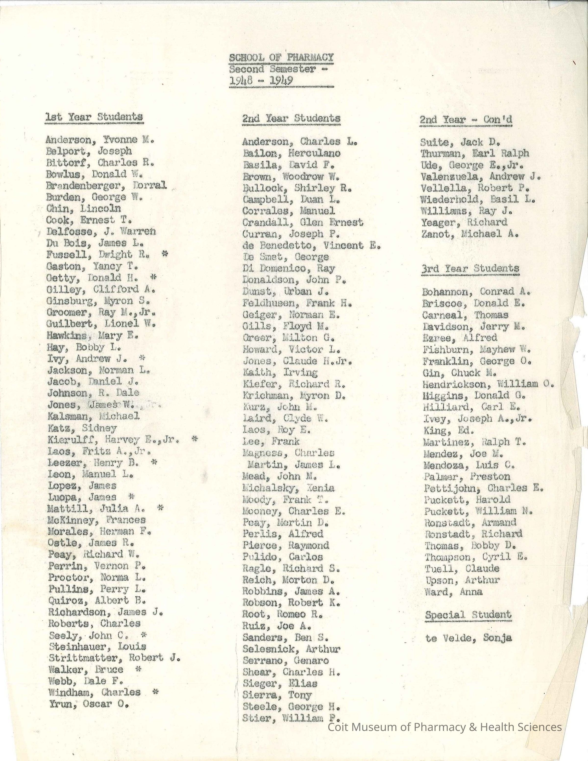 University of Arizona College of Pharmacy student list for second semester 1948-1949.