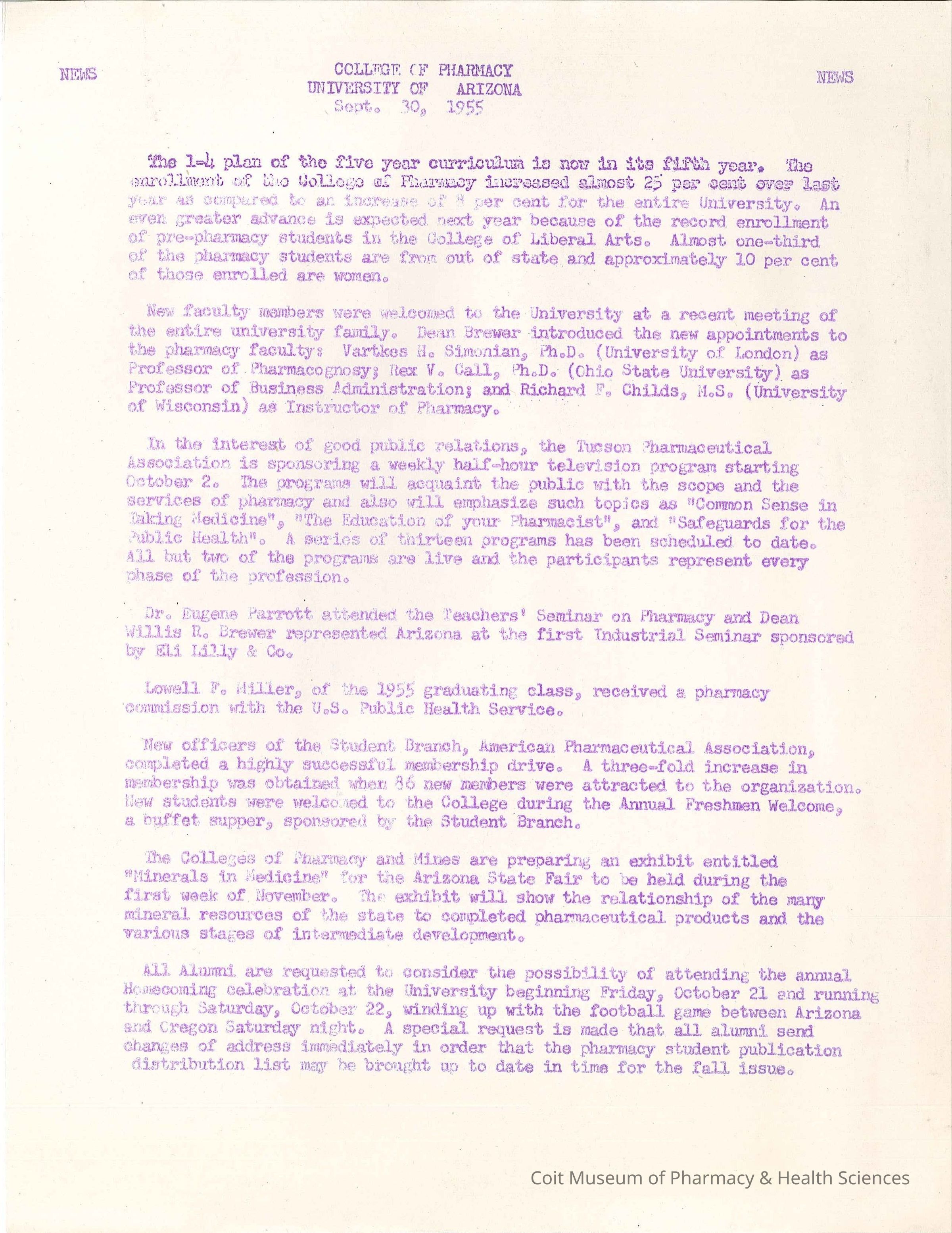 University of Arizona College of Pharmacy Newsletter from September 30, 1955.