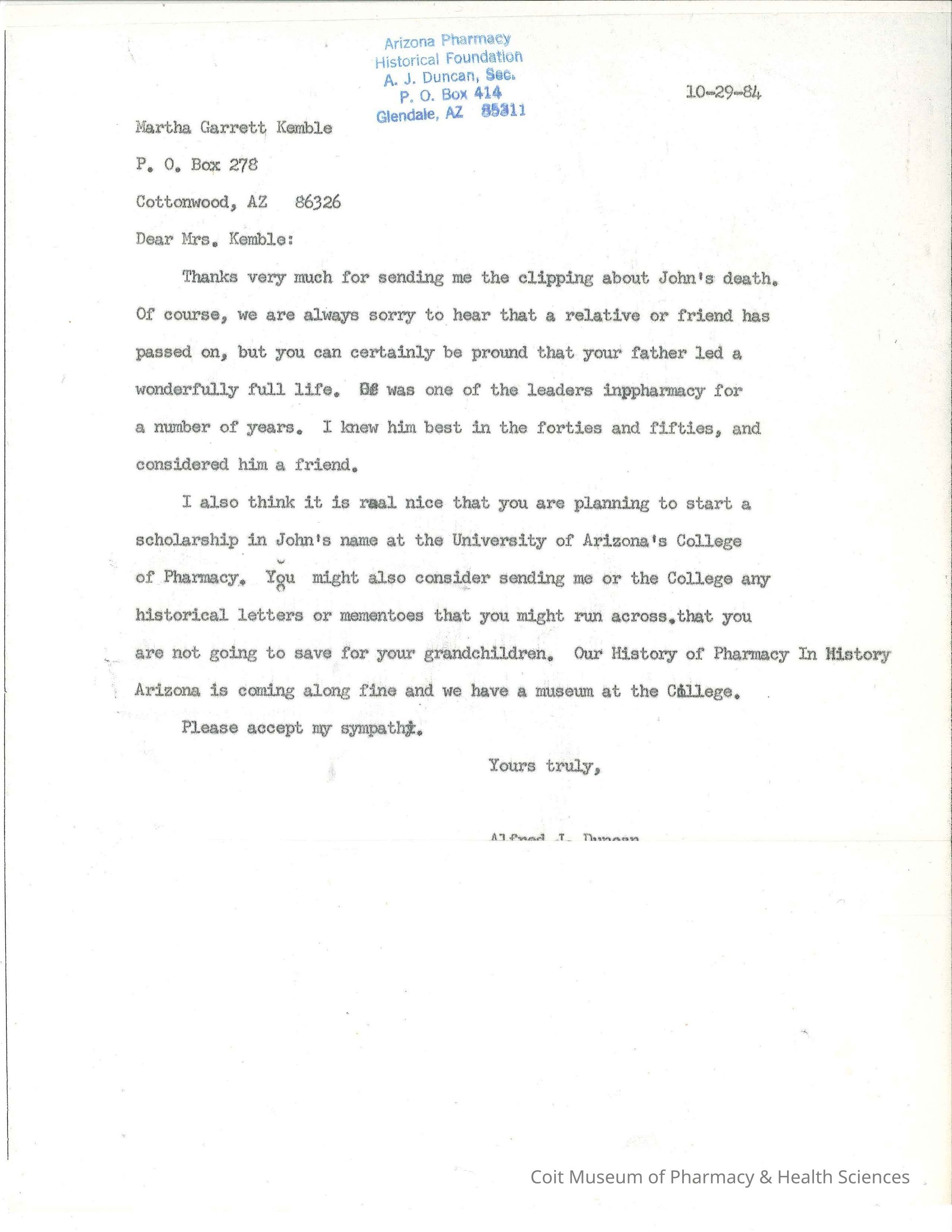 Letter from Alfred Duncan to Martha Garret Kimble concerning the obituary of her father, John Garrett. Refers to a possible scholarship in Garrett's name at the University of Arizona College of Pharmacy.Collection
