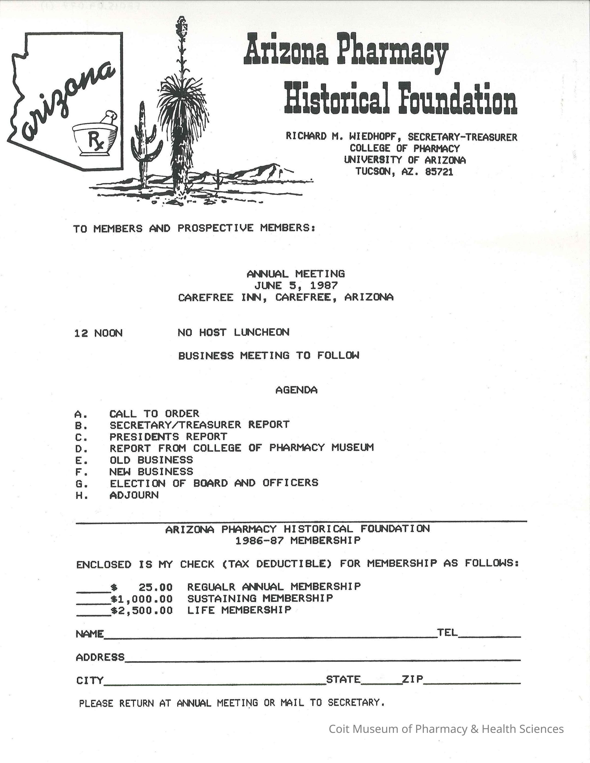 Agenda for the annual meeting of the Arizona Pharmacy Historical Foundation, 6/5/1987, in Carefree, AZ. [x3]Collection