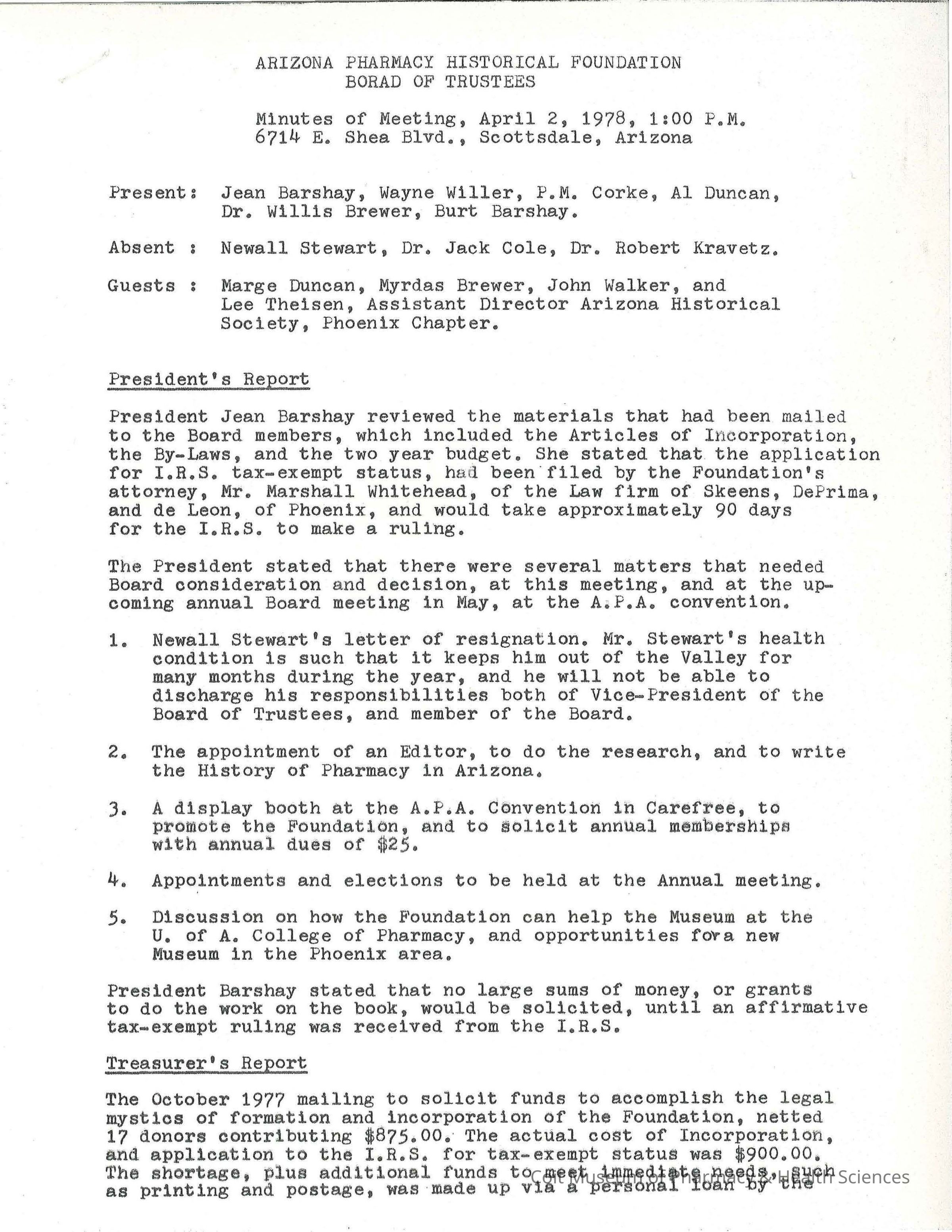 Minutes of Arizona Pharmacy Historical Foundation meeting, 4/2/1978.