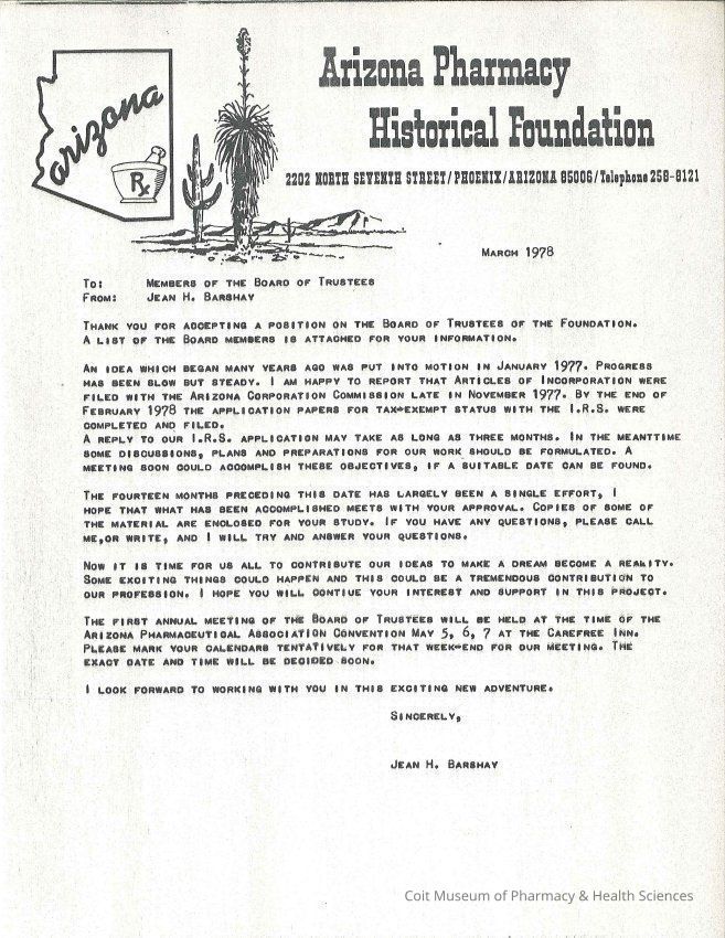 Letter to members of the Board of Trustees, Arizona Pharmacy Historical Foundation, from Jean Barshay. Attached is a list of members of the first Board of Trustees.