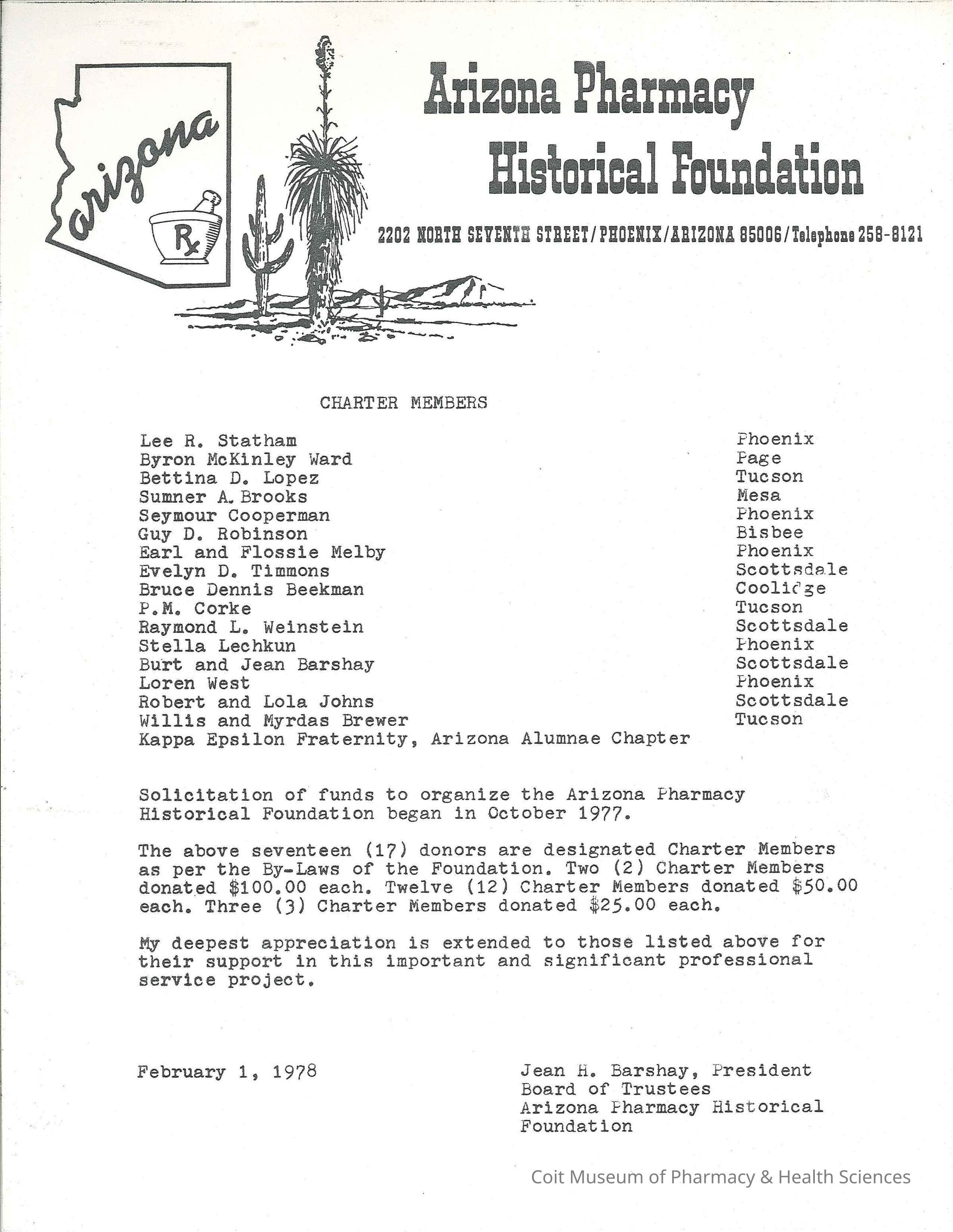 List of charter members of the Arizona Pharmacy Historical Foundation. Compiled by Jean H. Barshay.