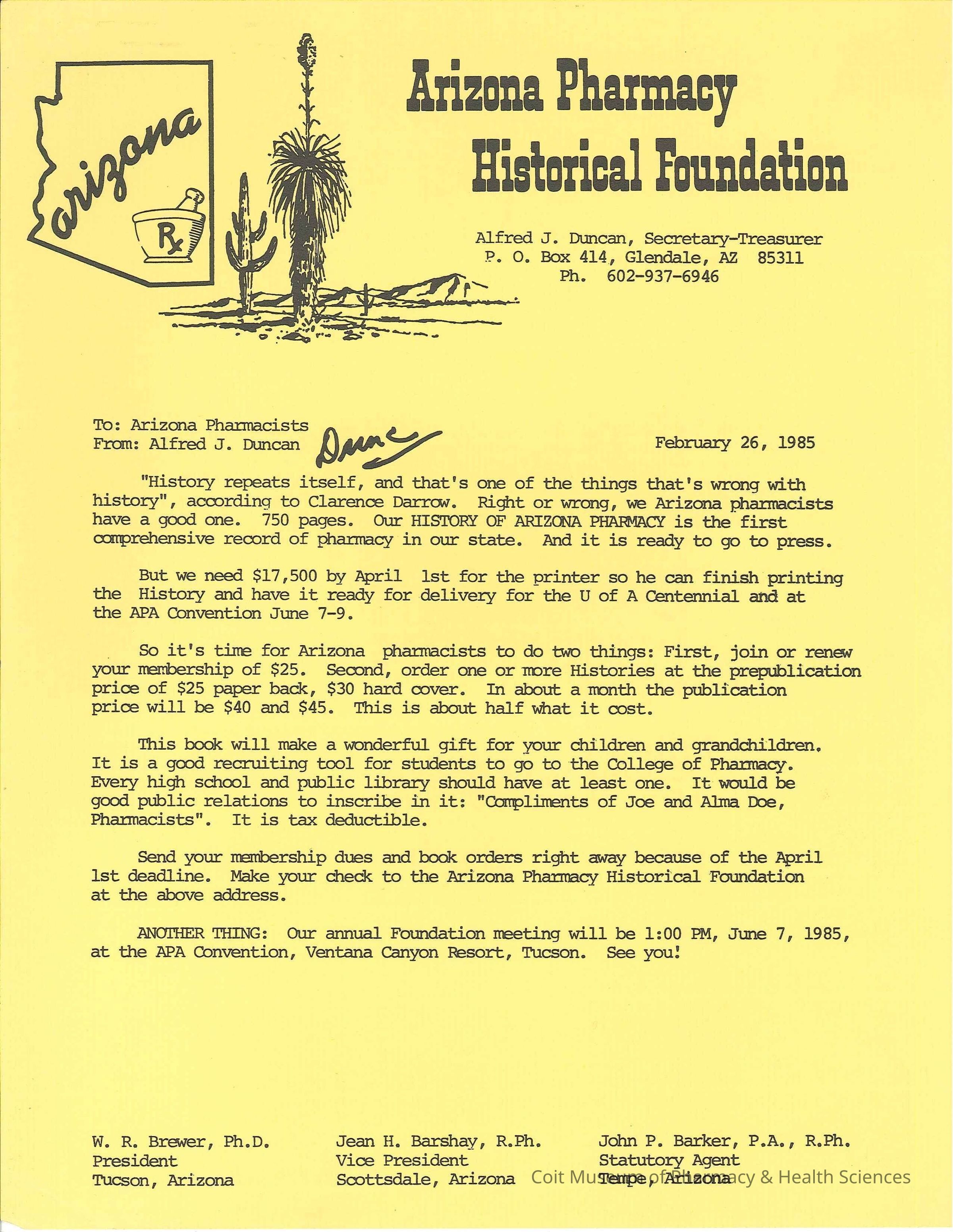 Letter from Alfred Duncan encouraging Arizona pharmacists to become members of the Arizona Pharmacy Historical Foundation and to purchase "A History of Arizona Pharmacy".