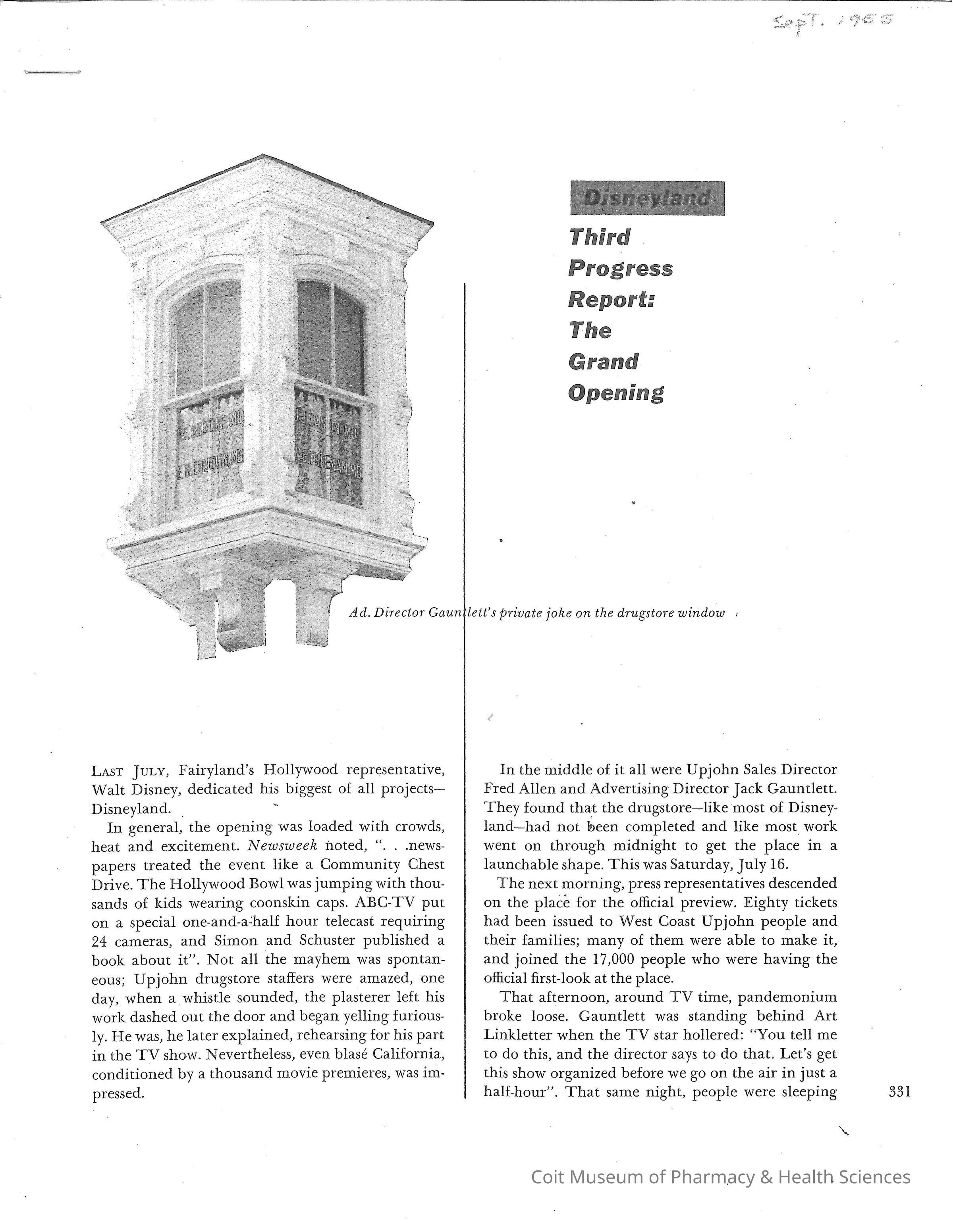 Article from Upjohn's "Overflow" Magazine, detailing the third progress report of the Upjohn Pharmacy in Disneyland.Collection