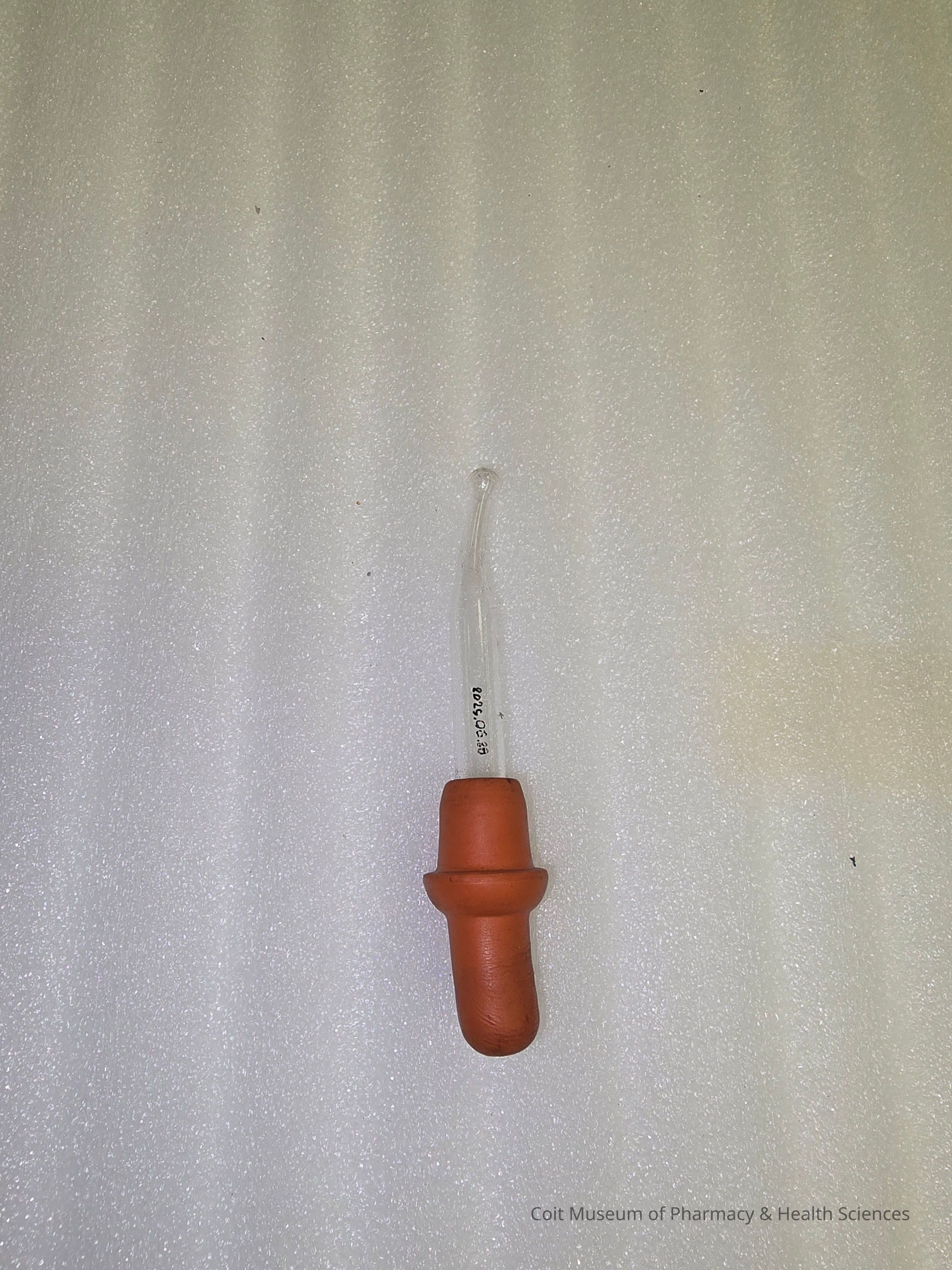 Glass dropper with terracotta rubber handle and a bulbous end. The rubber has hardened and is no longer flexible.Collection