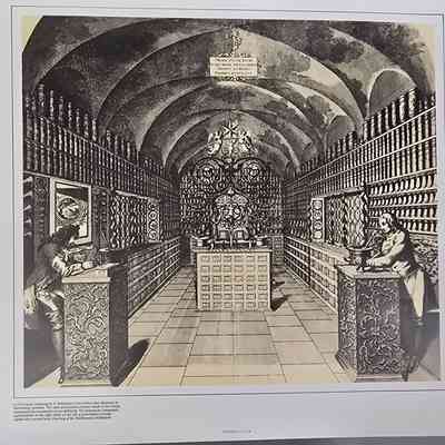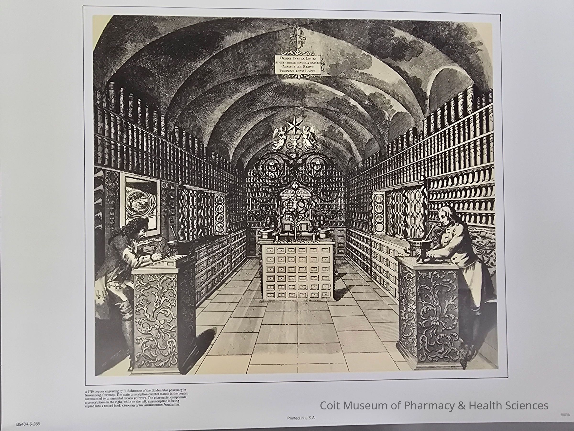 A print, printed in the USA, of a 1710 copper engraving by H. Bormann of the Golden Star pharmacy in Nuremberg, Germany. The main prescription counter stands in the center, surmounted by ornamental rococo grillwork. The pharmacist compounds a prescription on the right; while on the left, a prescription is being copied into a record book. Courtesy of the Smithsonian Institution.Collection