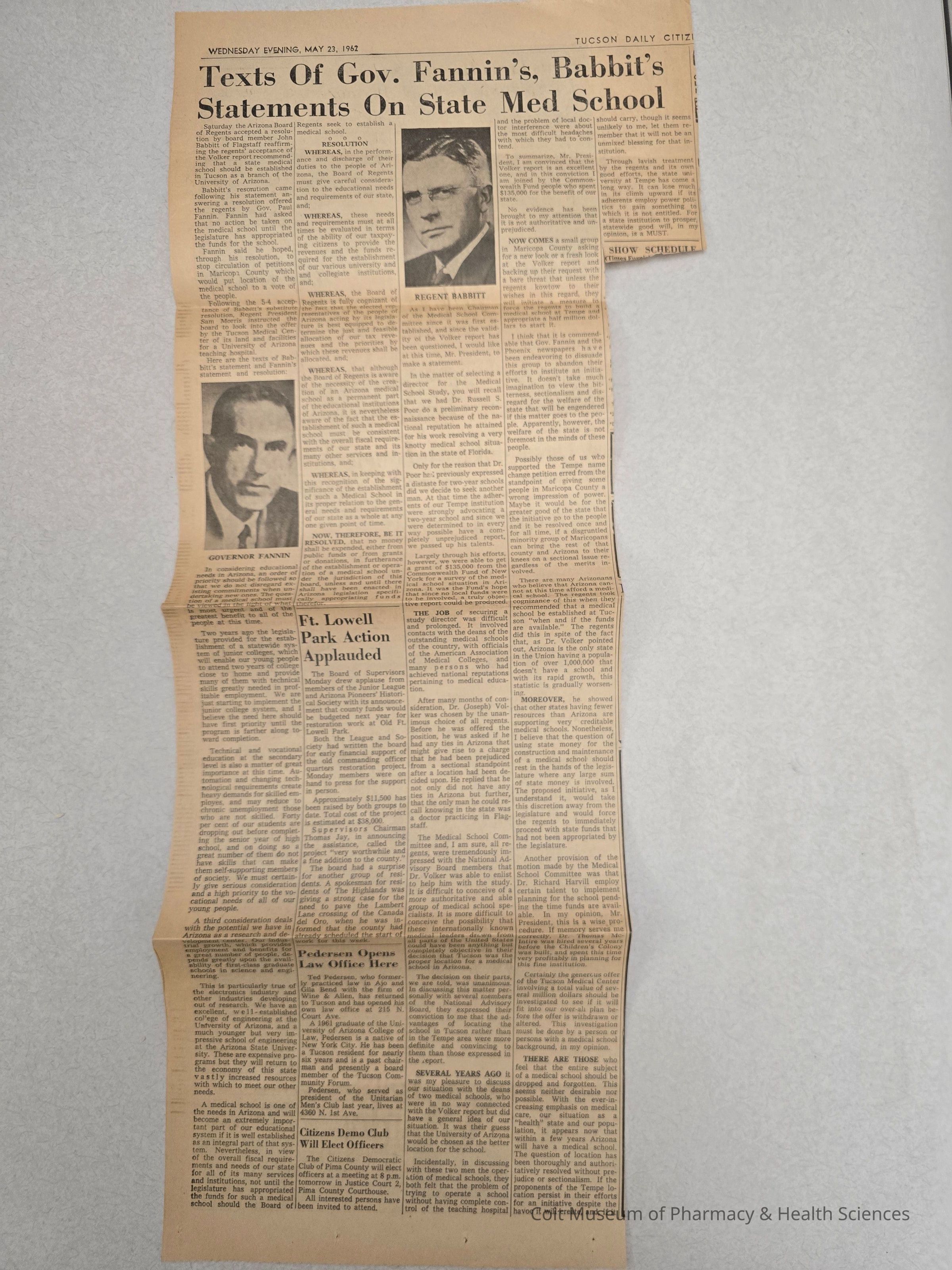 A newspaper clipping from Wednesday, May 23, 1962 titled 'Texts of Gov. Fannin's, Babbit's Statements on State Med School.