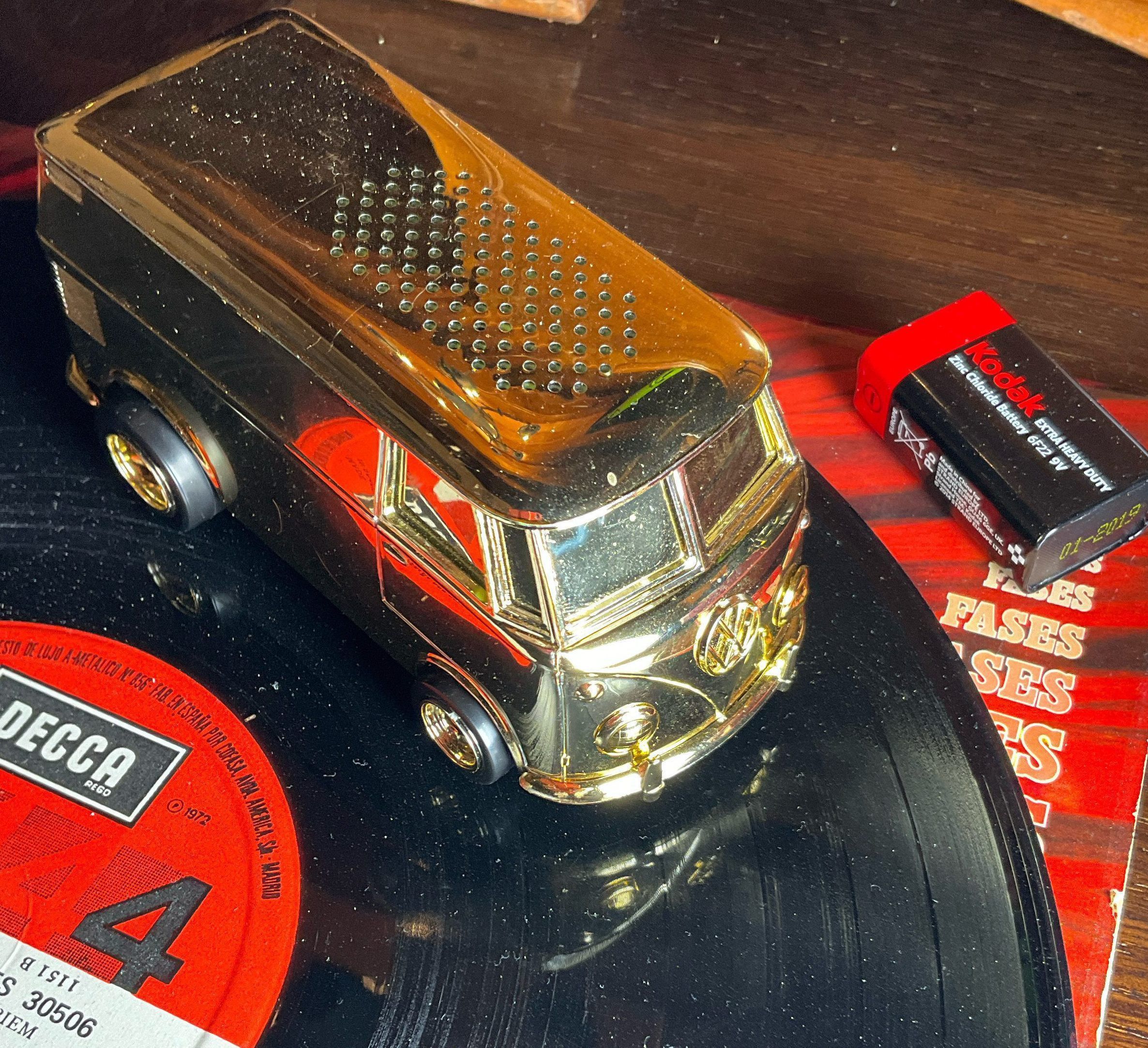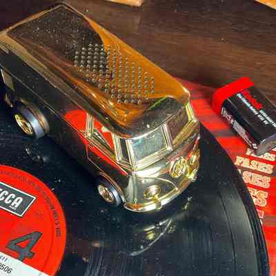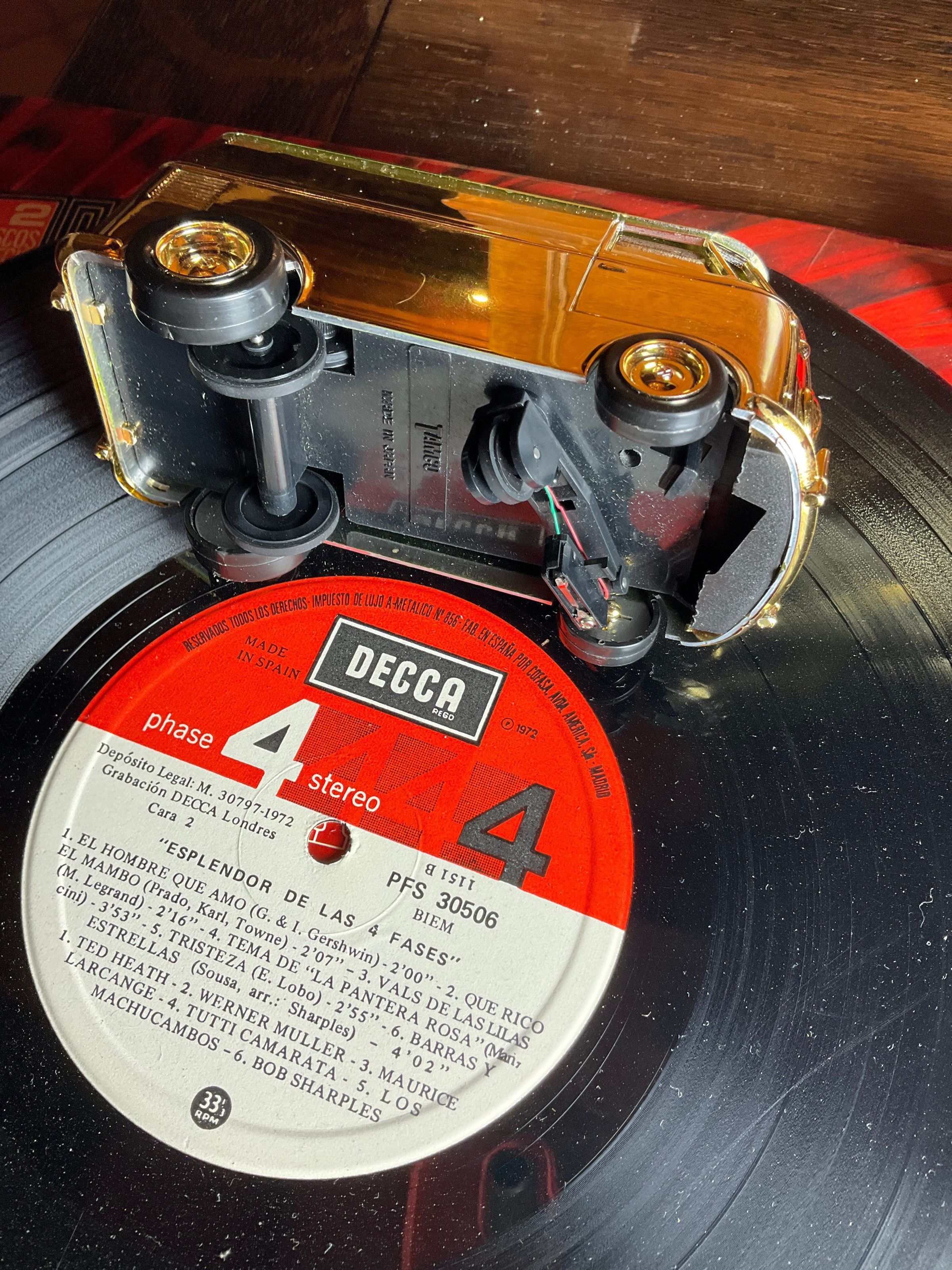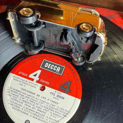 Gramofon divertit. El cotxe es mou per sobre el disc mentre capta la musicaLocation