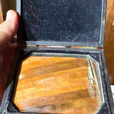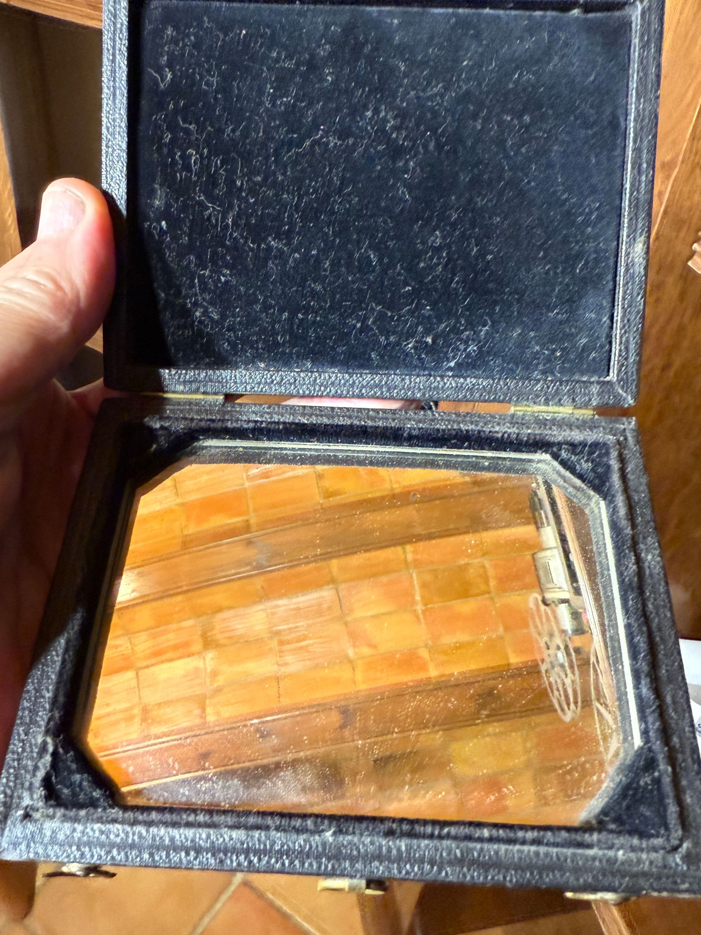 Gràcies per la imatge. El que mostres sembla ser una caixa estotjada d’un daguerreotip del segle XIX. Aquestes capsetes, sovint folrades de vellut i amb una petita frontissa, contenien un daguerreotip (una de les primeres formes de fotografia), protegit per una coberta de vidre, una muntura metàl·lica, i sovint un mirall o superfície brillant com la que veiem a la foto. Aquest mirall no era funcional com a mirall d’ús personal, sinó que formava part de la protecció i presentació del daguerreotip.