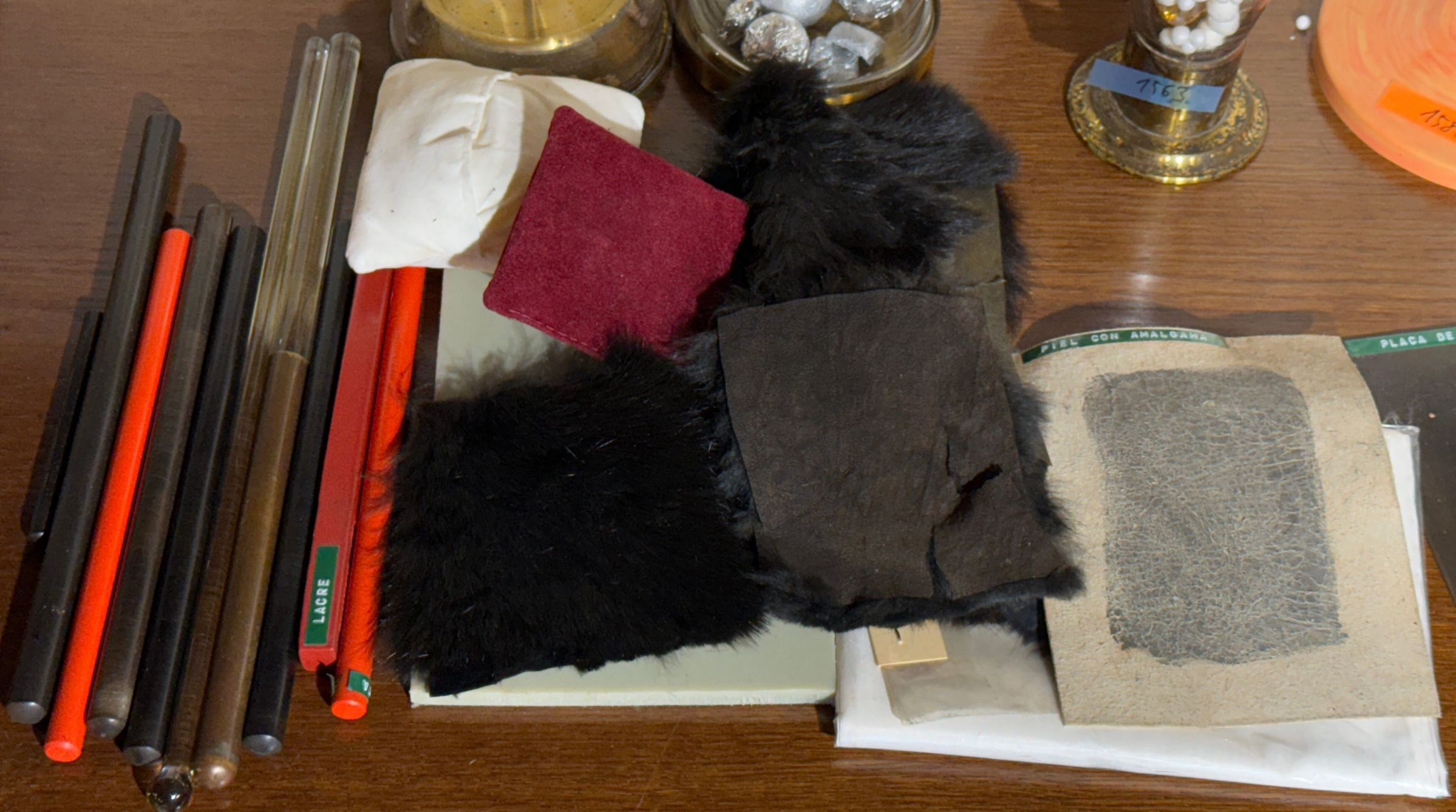 Material vari (barretes de plàstic, lacre, pells...) per experiments d'electrostàticaLocation