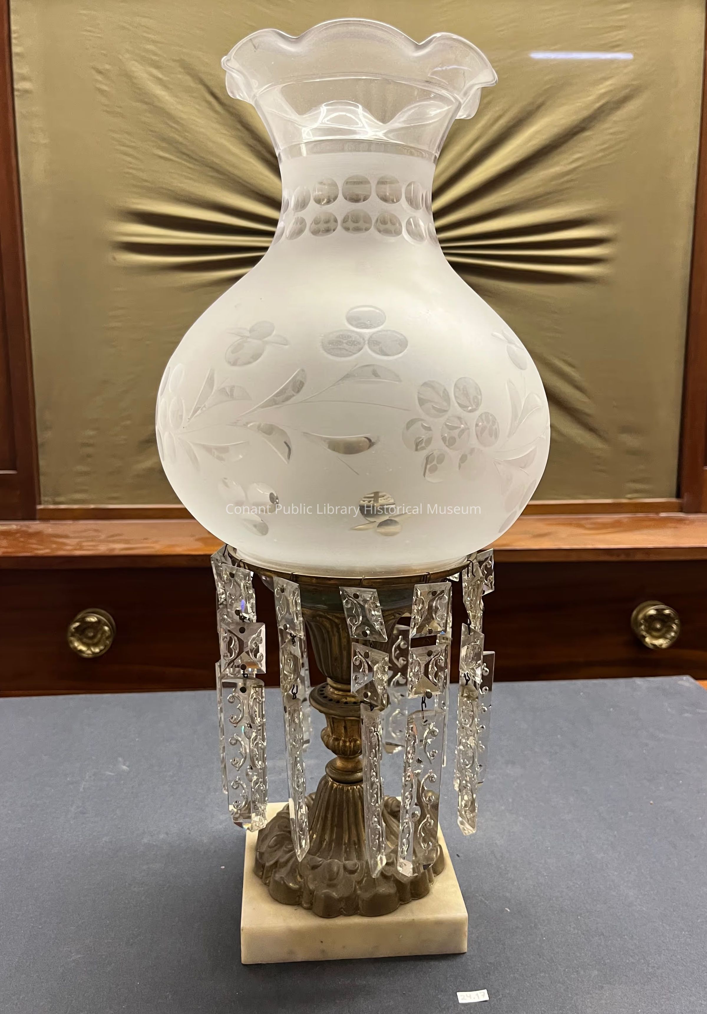 Oil lamp with frosted glass shade, dangling crystal ornaments, and marble baseContext