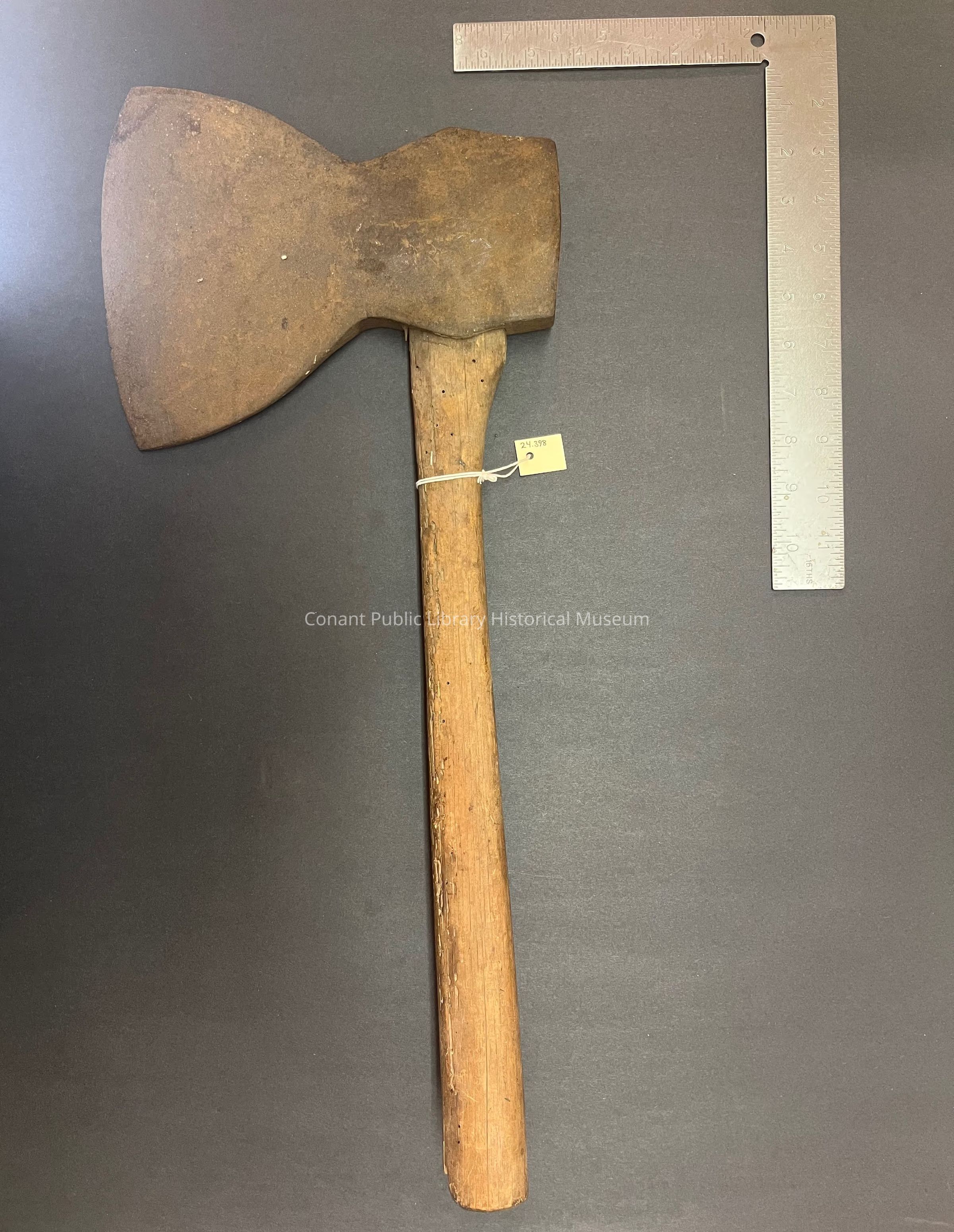 Metal axe head with wooden handle.
