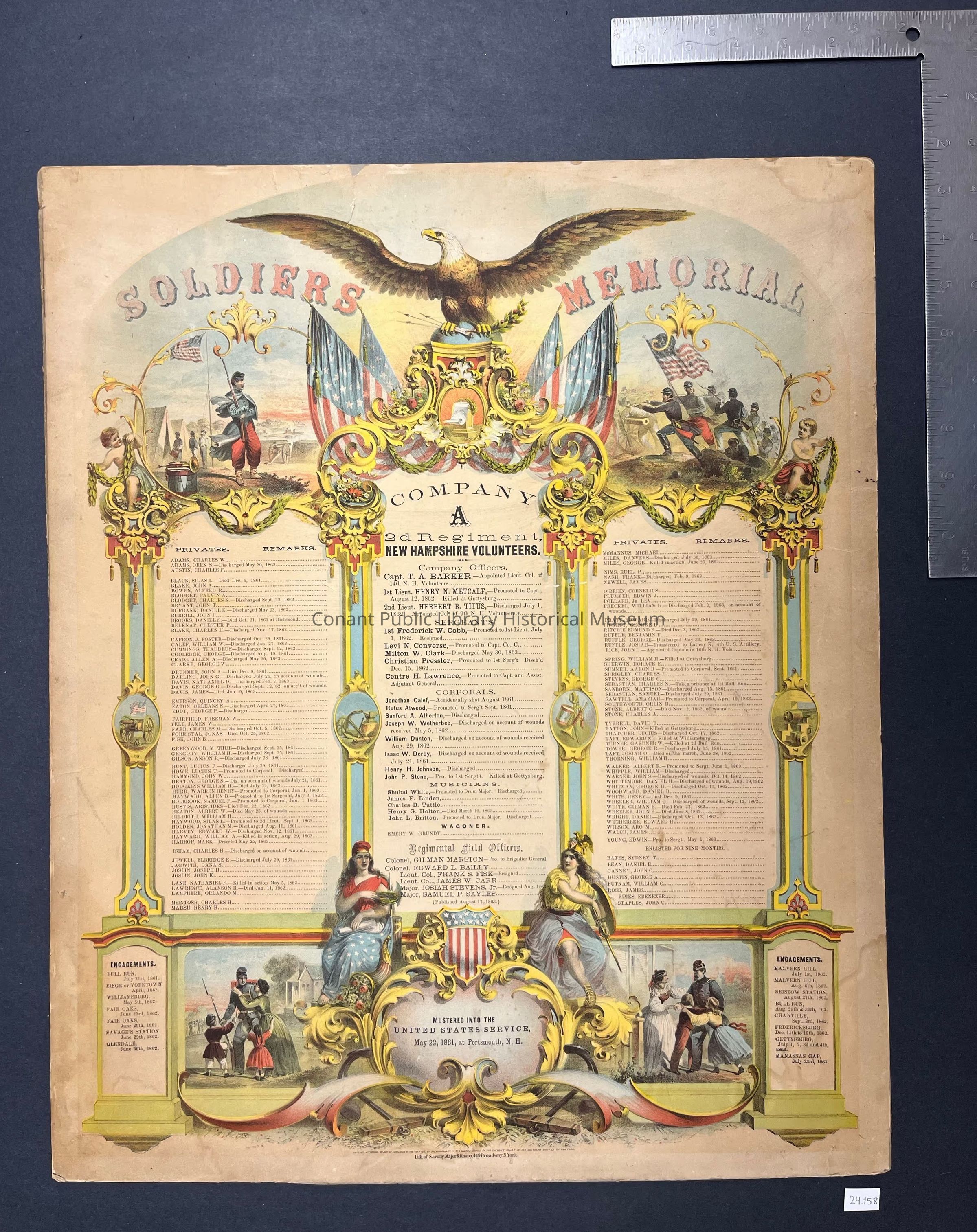 This lithograph was created by the lithograph company Sarony, Major & Knapp and published J.C. Fuller & Co. At the time of the Civil War, the lithograph was the most common method used for the mass production of images. Lithographs were cheaper and more accessible to the general public, and lithographs like this one were a common decoration in middle class homes. The same image was reproduced in color and in black and white, with different companies and regiments of the Union Army memorialized. An impression of the same chromolithograph memorializing the 2nd Regiment of New Hampshire Volunteers, Company C is part of the collection of the New Hampshire Historical Society.