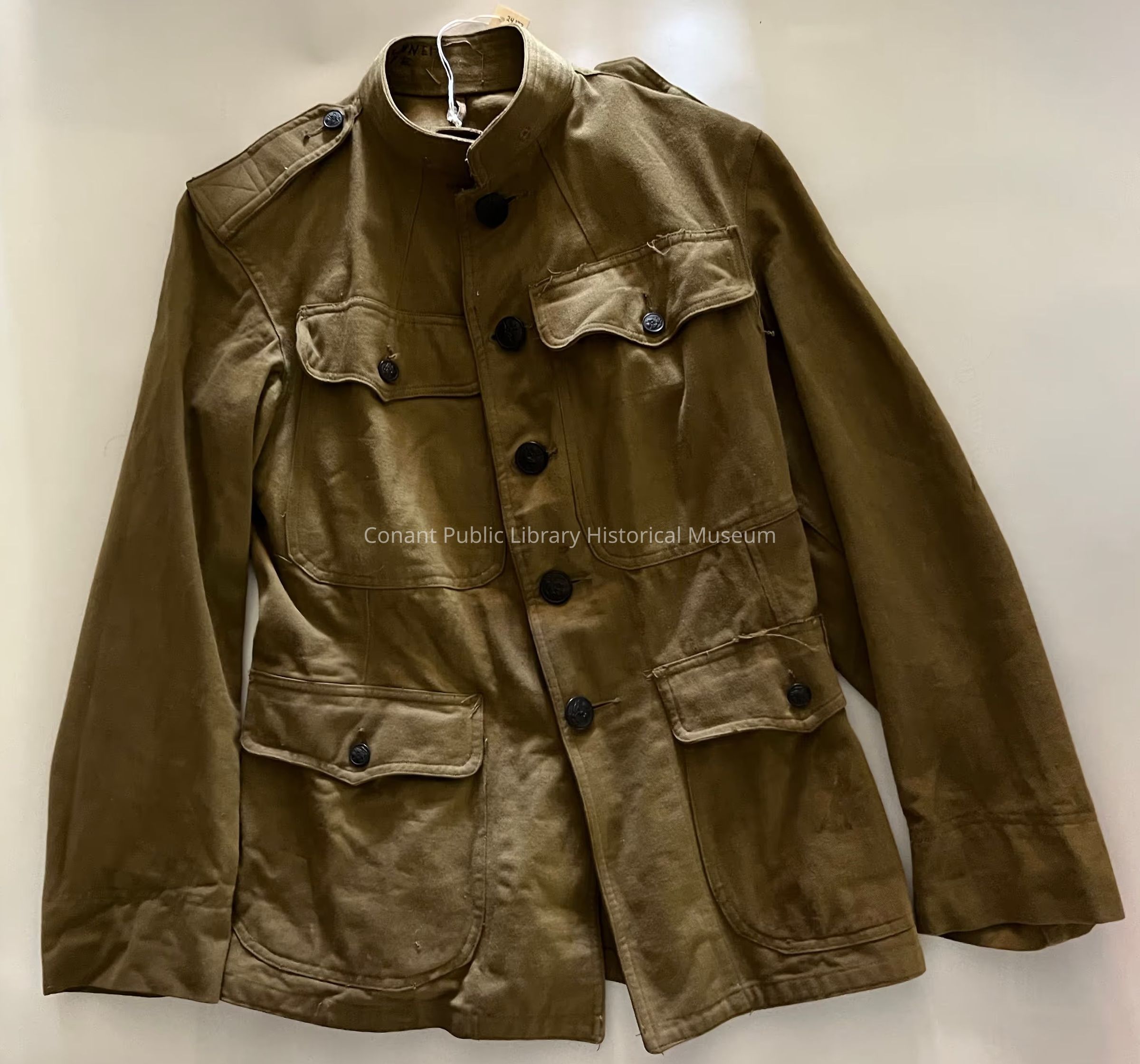Green military jacket with brown metal buttons.Clothing/Dress/Costume Details