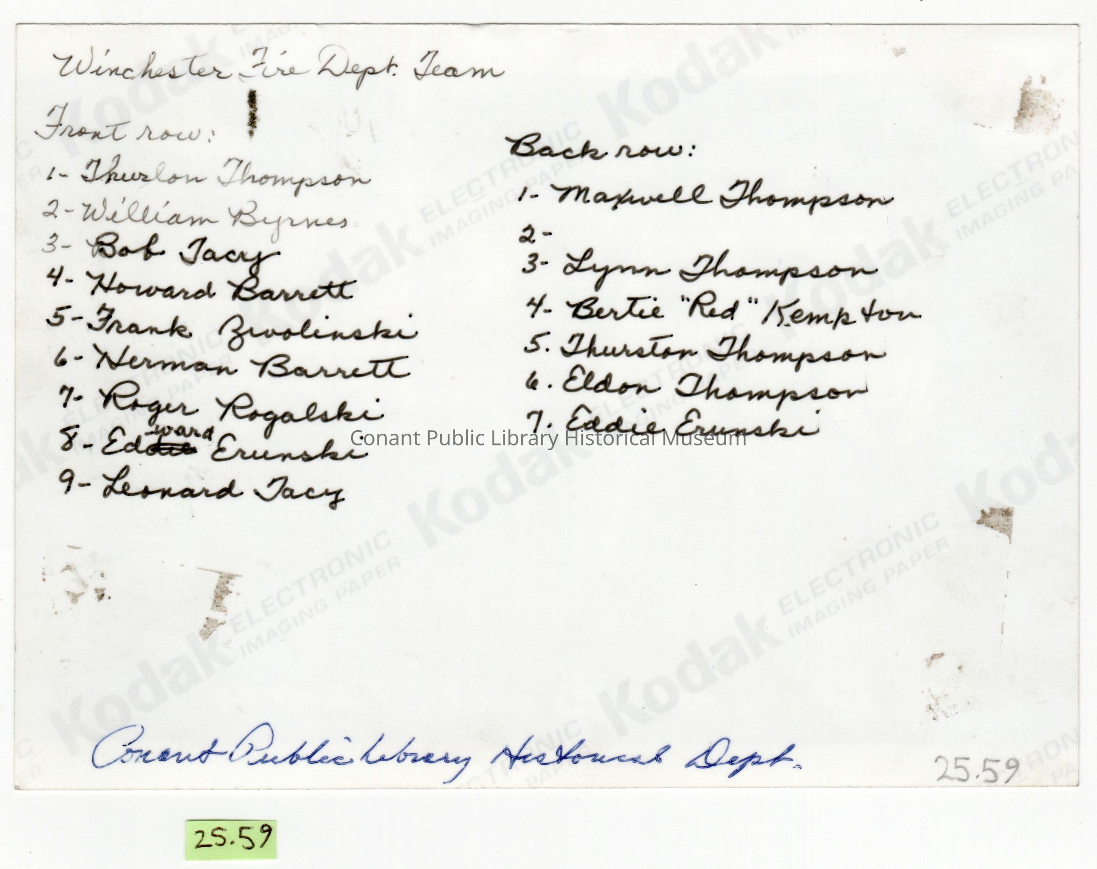 Winchester Fire Department, Thurlon M. Thompson, Maxwell G. Thompson, Lynn L. Thompson, Eldon Emond Thompson, William Byrnes, Bob Tacy, Leonard Patrick Tacy, Howard M. Barrett, Herman Eugene Barrett, Frank C. Zwolinski, Roger Alexander Rogalski, Edward Roger Erunski, Bertie Freeman Kempton, Eddie Stanislaw Erunski