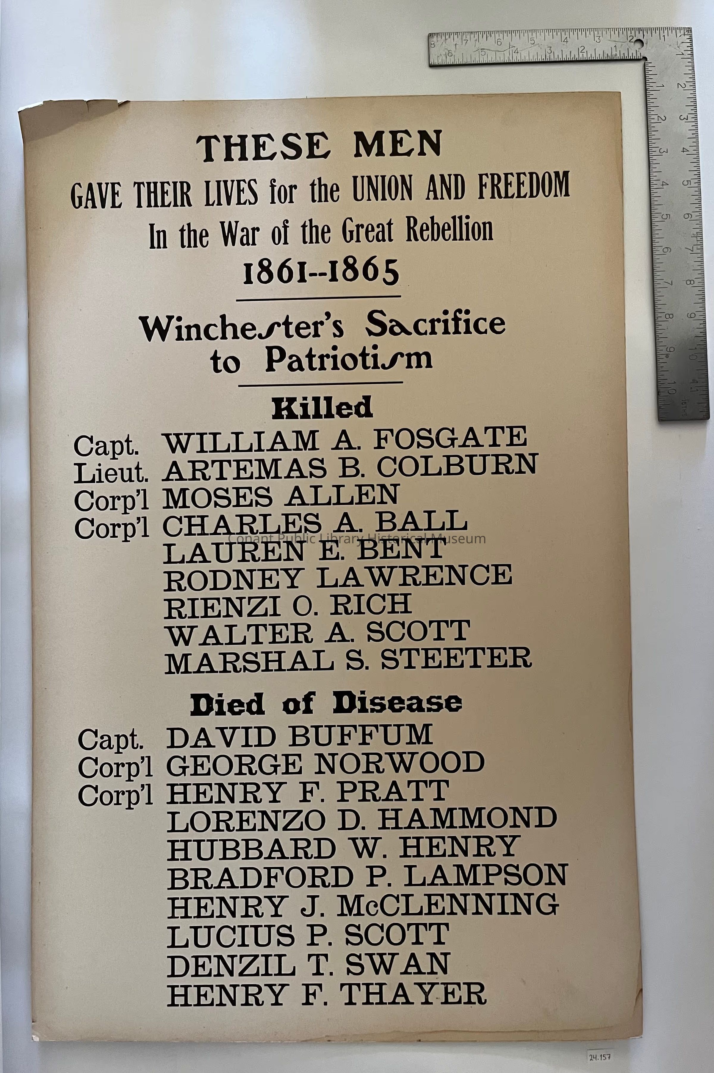 The commemorative poster entitled “Winchester’s Sacrifice to Patriotism” was created in the wake of the Civil War to memorialize Winchester’s soldiers who died in service. The first two men listed are Captain William A. Fosgate (27 June 1839–19 September 1864) and Artemas B. Colburn (1 August 1838–20 September 1864), both of whom served in the 14th Regiment of New Hampshire Volunteers and died as a result of injuries sustained during the Third Battle of Winchester, known also as the Battle of Opequon. Fosgate and Colburn’s likenesses appear on the top and bottom, respectively, of the figure titled “Officers Killed at Opequon” in Francis Henry Buffum’s (21 October 1879–19 August 1967) History of the Fourteenth New Hampshire, and are listed on the Soldier’s Memorial, Fourteenth Regiment of New Hampshire Volunteers Company F lithograph produced by Currier & Ives.