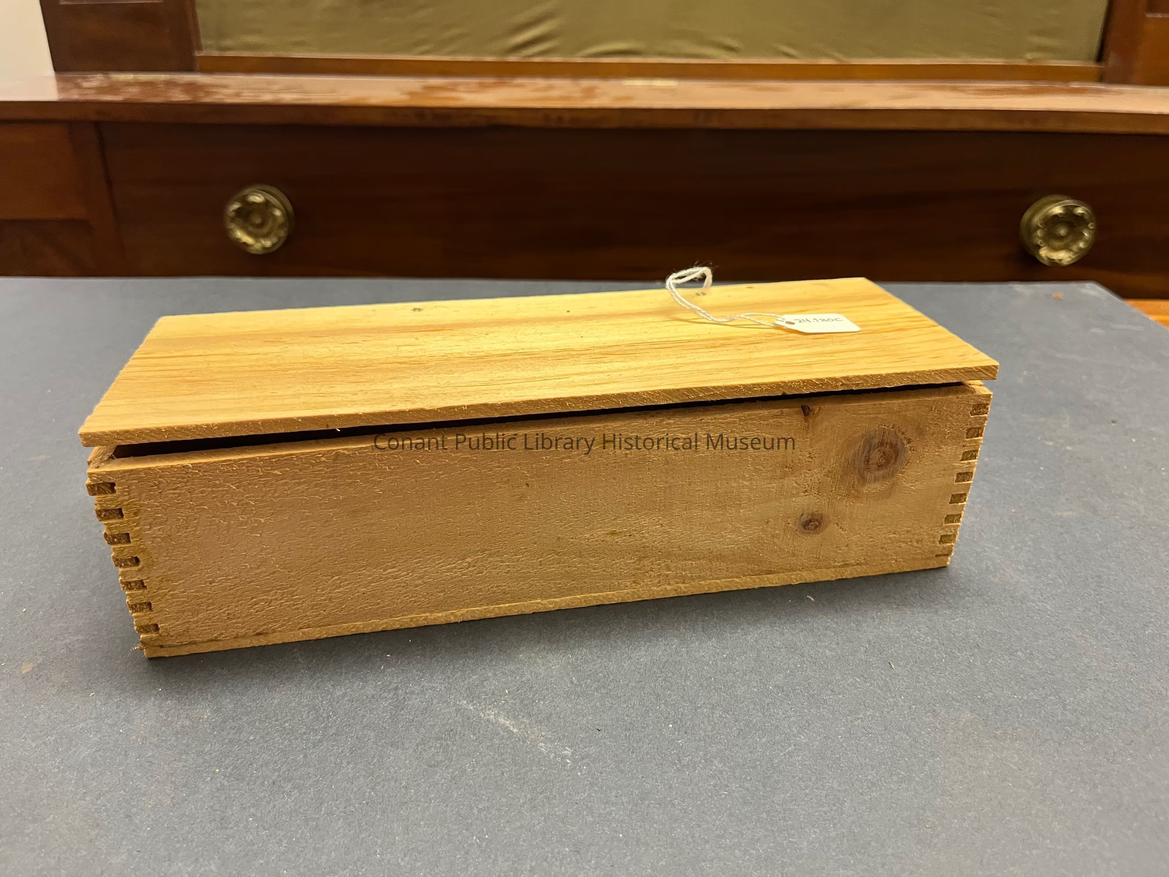 Unfinished wooden nesting box with box joint corners and metal hinges.Acquisition