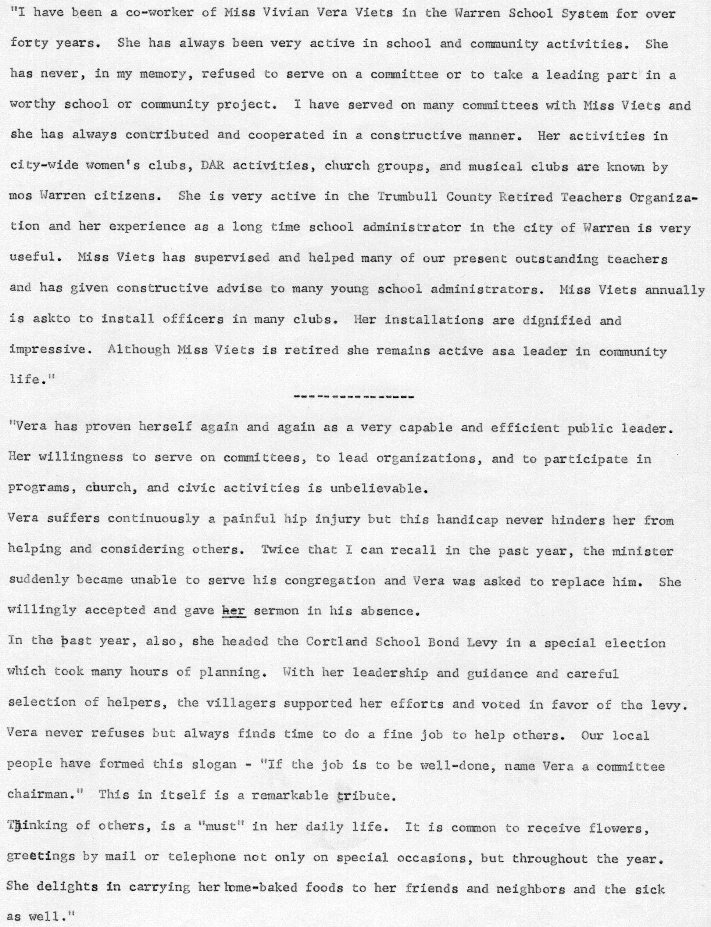 Woman of the Year comments from a co-worker for Vera VietsEntry/Object ID