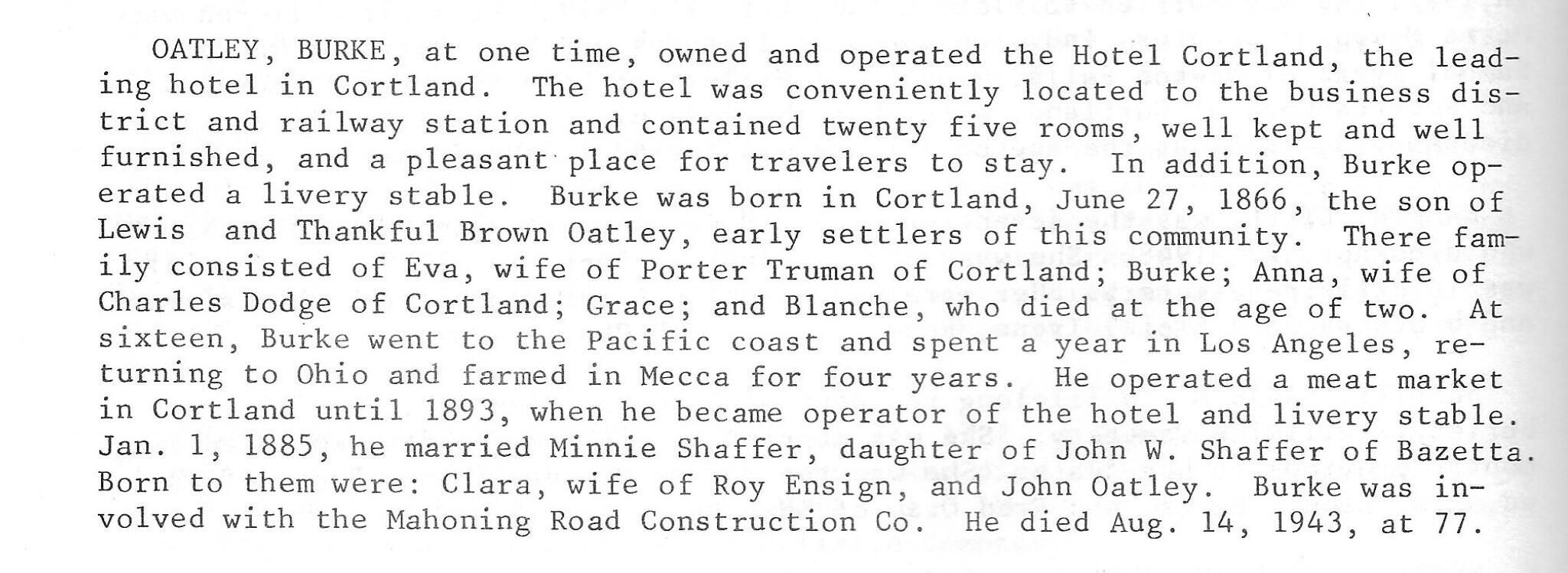Burke Oatley was a descendent of early settlers and operated a hotel and livery in Cortland