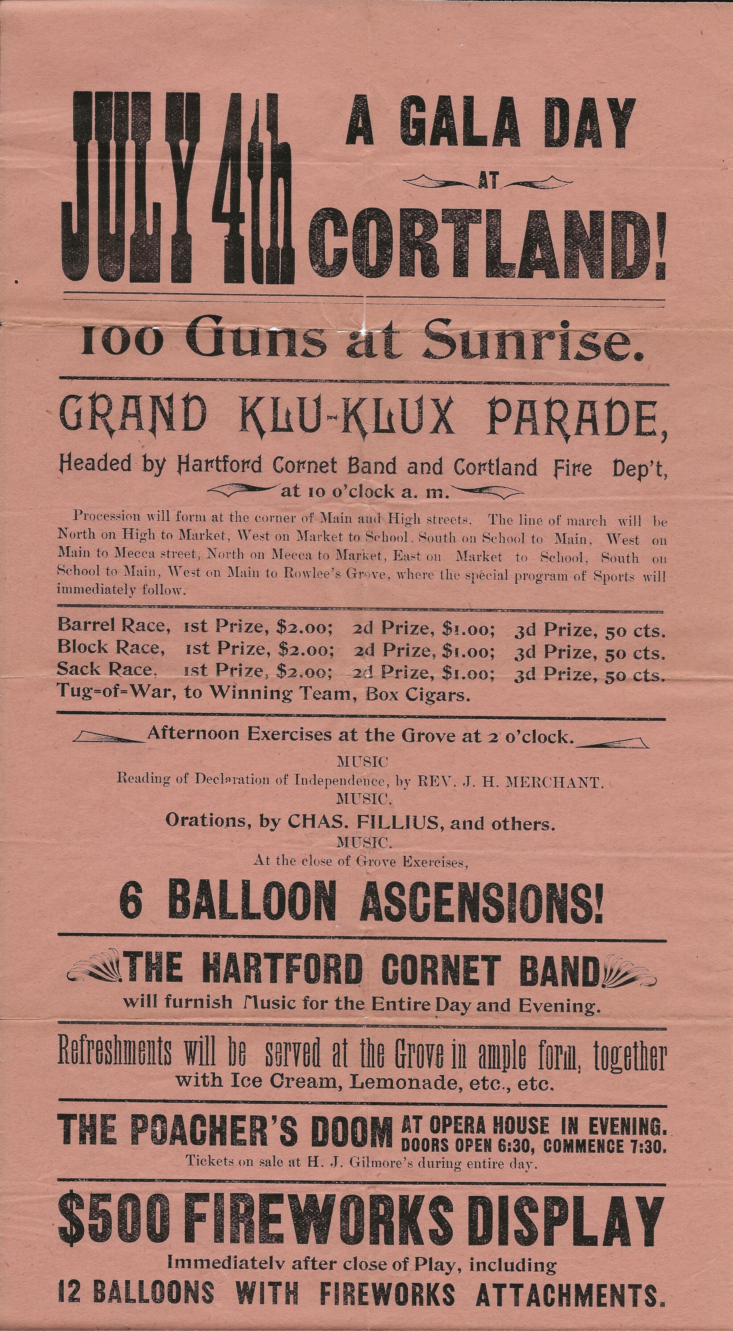 An undated flier for a July 4th celebration with games and a parade. followed by a play at the Opera House "A Poacher's Doom"Acquisition