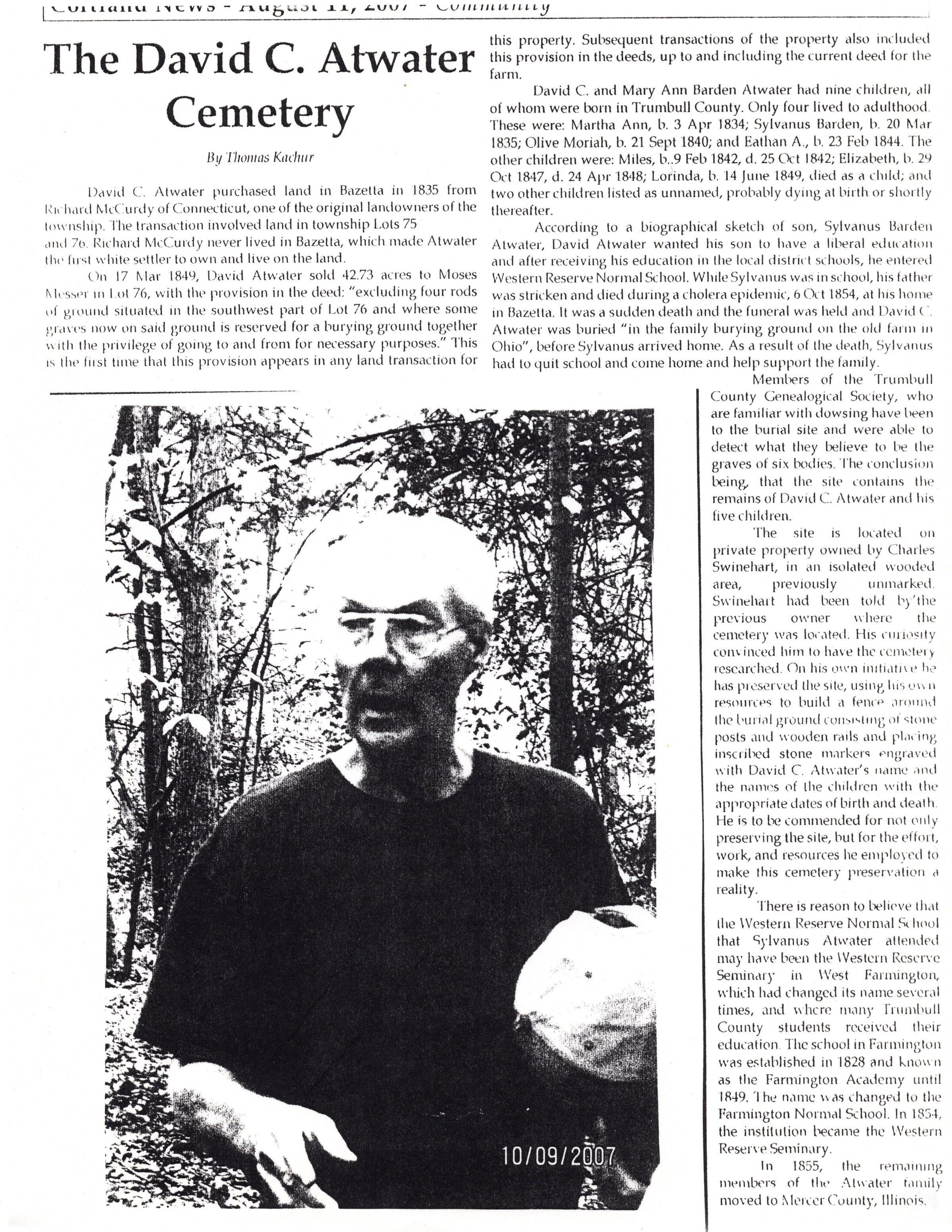 The David C. Atwater Cemetery Article from the Cortland News by Thomas Kachur