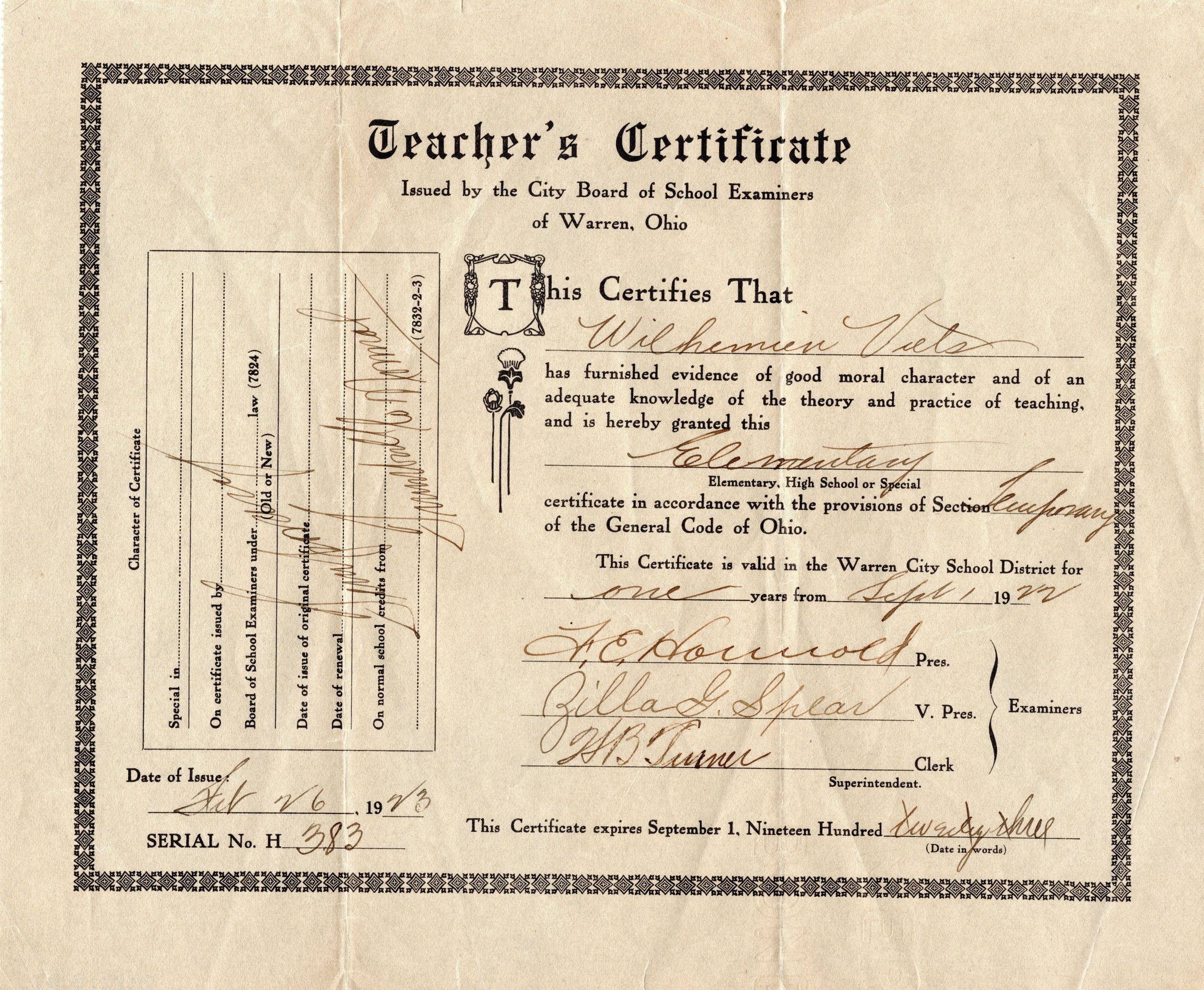 Wilhemien Viets Warren Teacher's Certificate 1923Entry/Object ID
