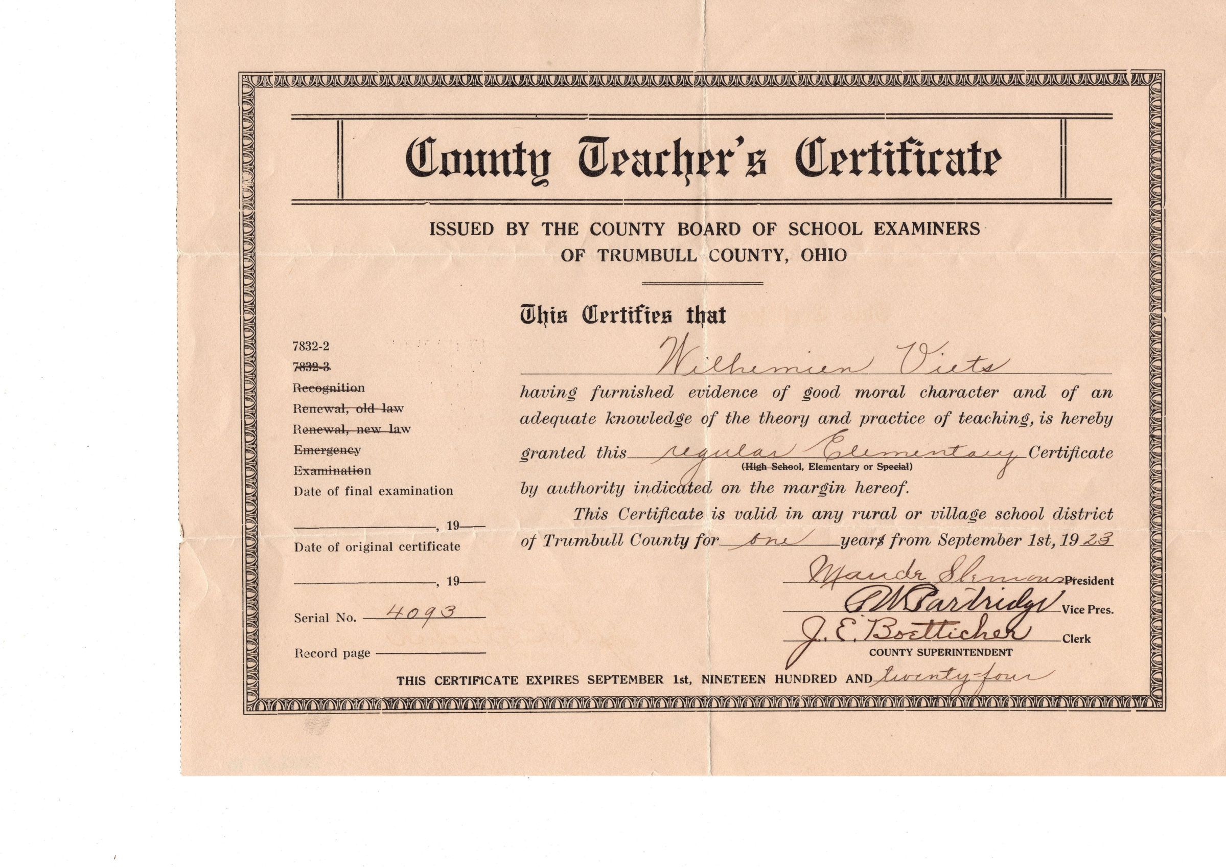Wilhemien Viets County Teacher's CertificateEntry/Object ID
