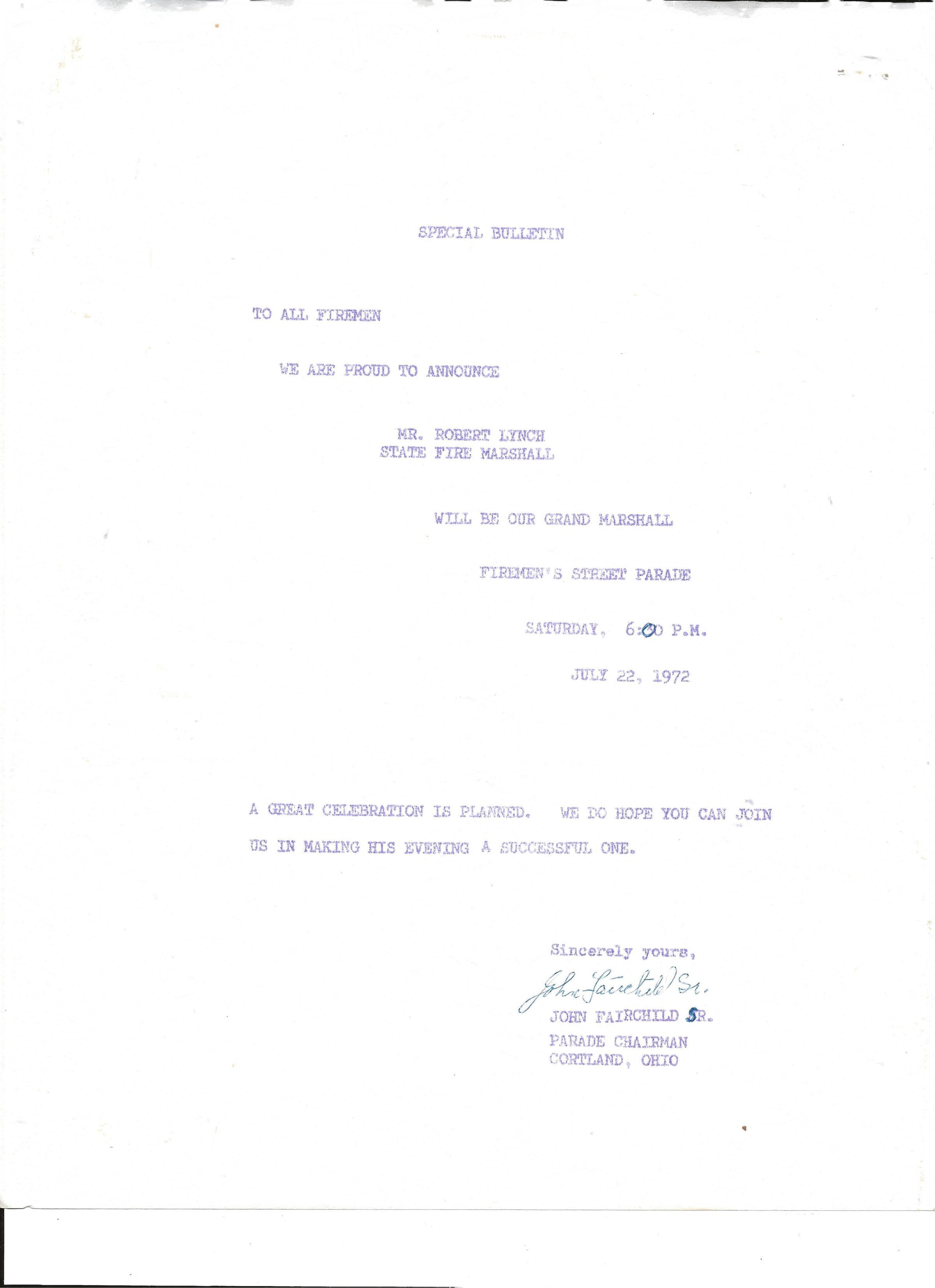 Announcement of Grand Marshal 1972 Street Fair - Robert Lynch - State Fire MarshalCollection