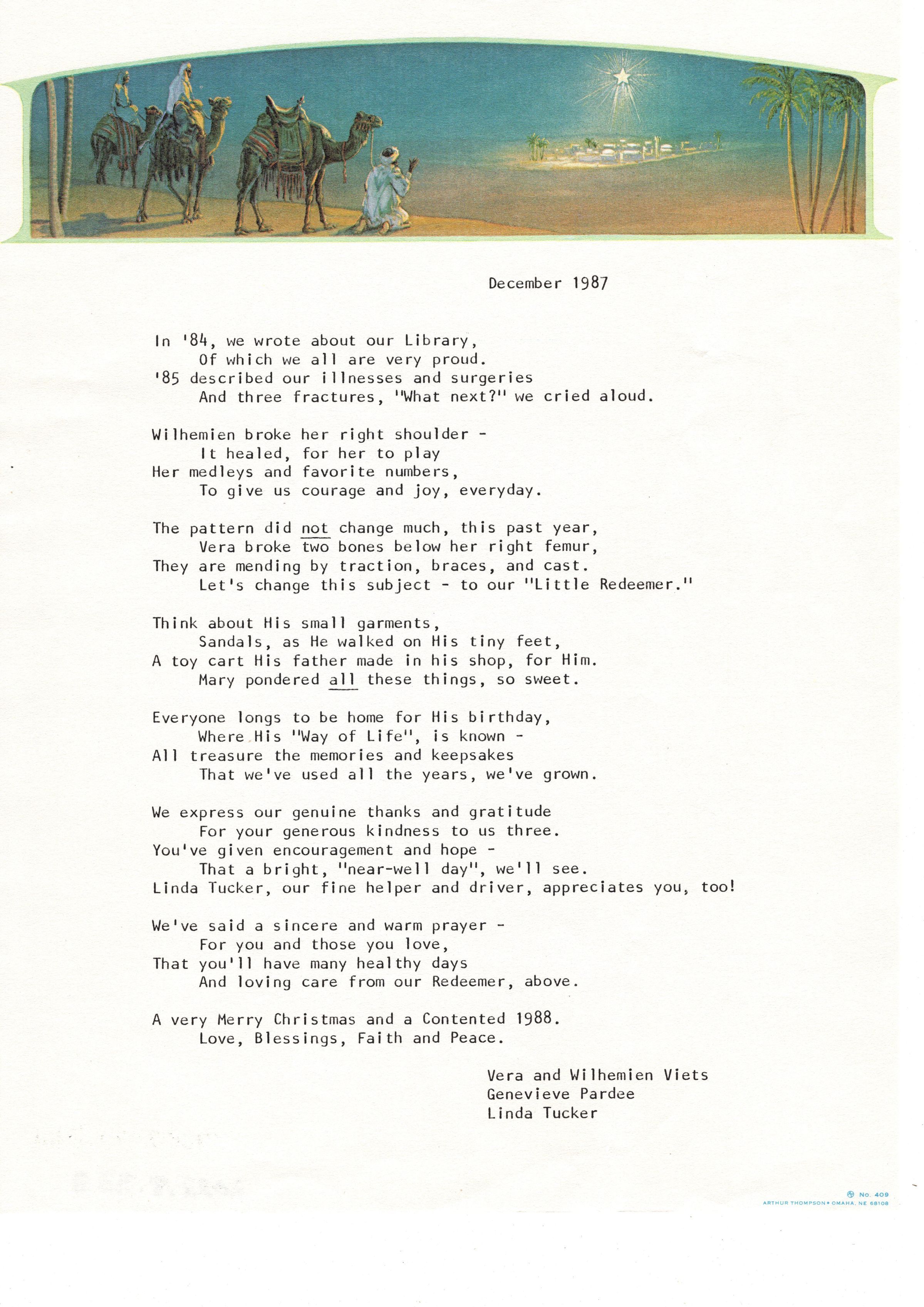 Christmas poem from December 1987 about the past year by Vera and Wilhemien Viets, Genevieve Pardee, and Linda TuckerCollection