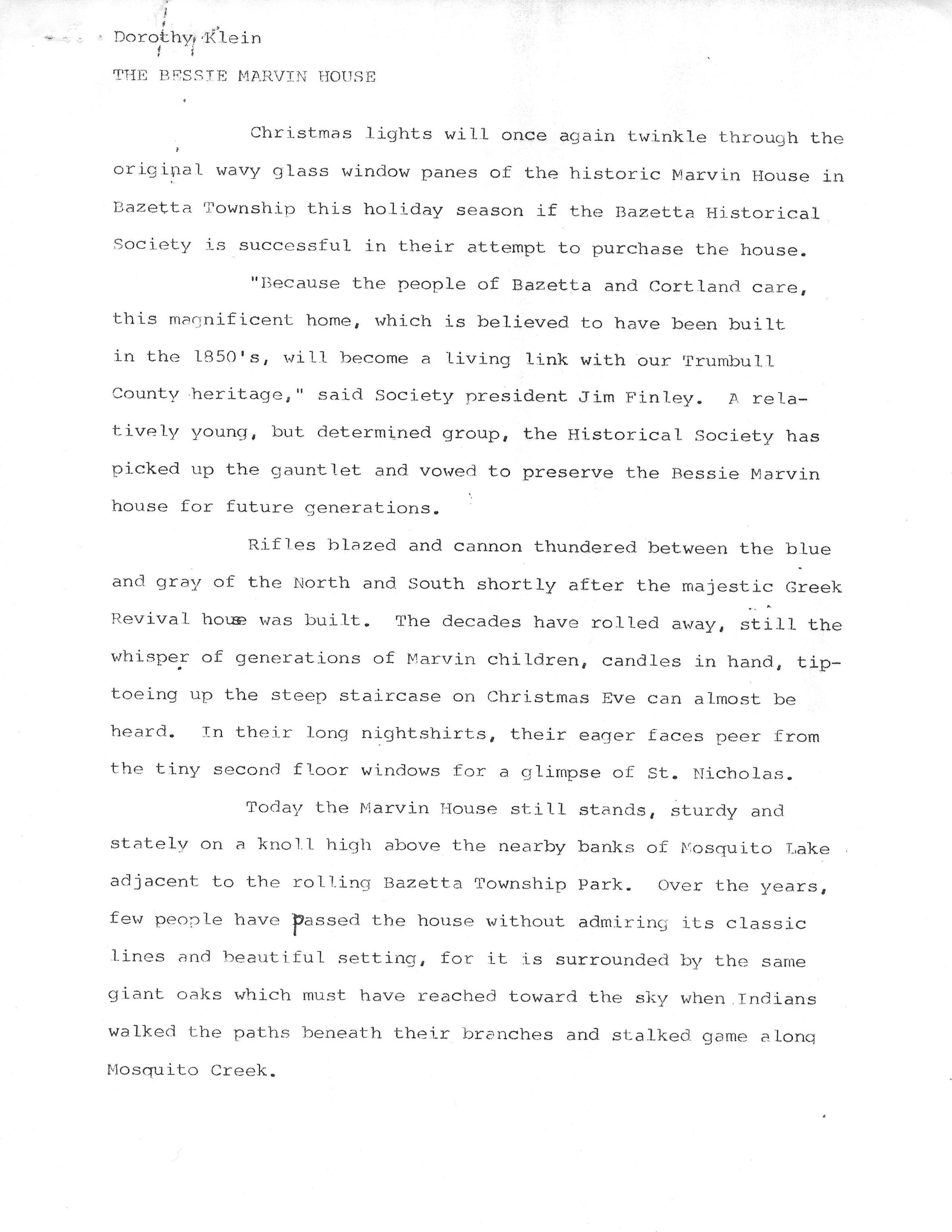 Article written by Dorothy Klein about the acquisition of the Marvin house by the Bazetta Historical Society