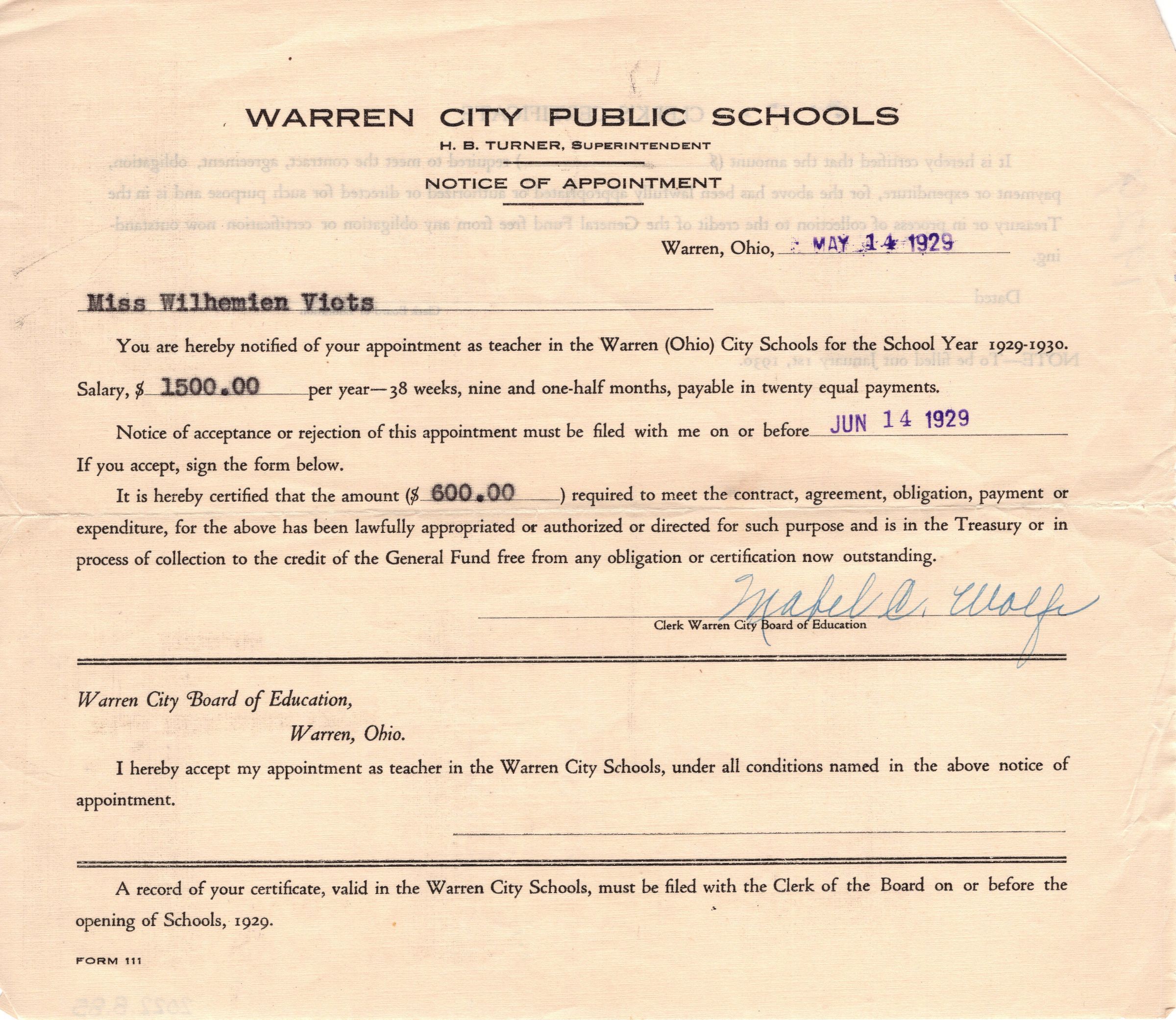 Wilhemien Viets Warren Notice of Appointment 1929Collection