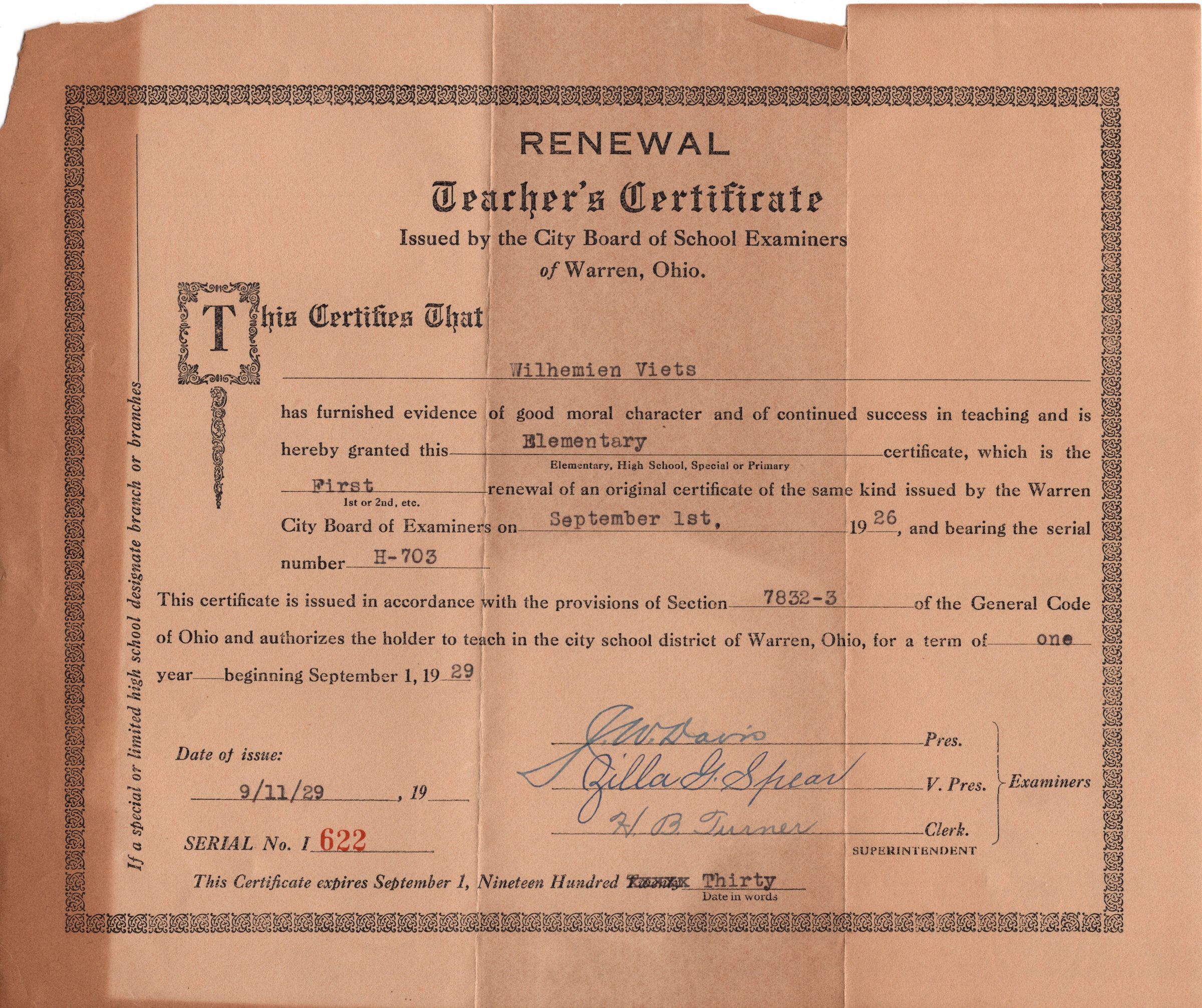Wilhemien Viets Warren Teacher's Certificate renewal 1929Collection