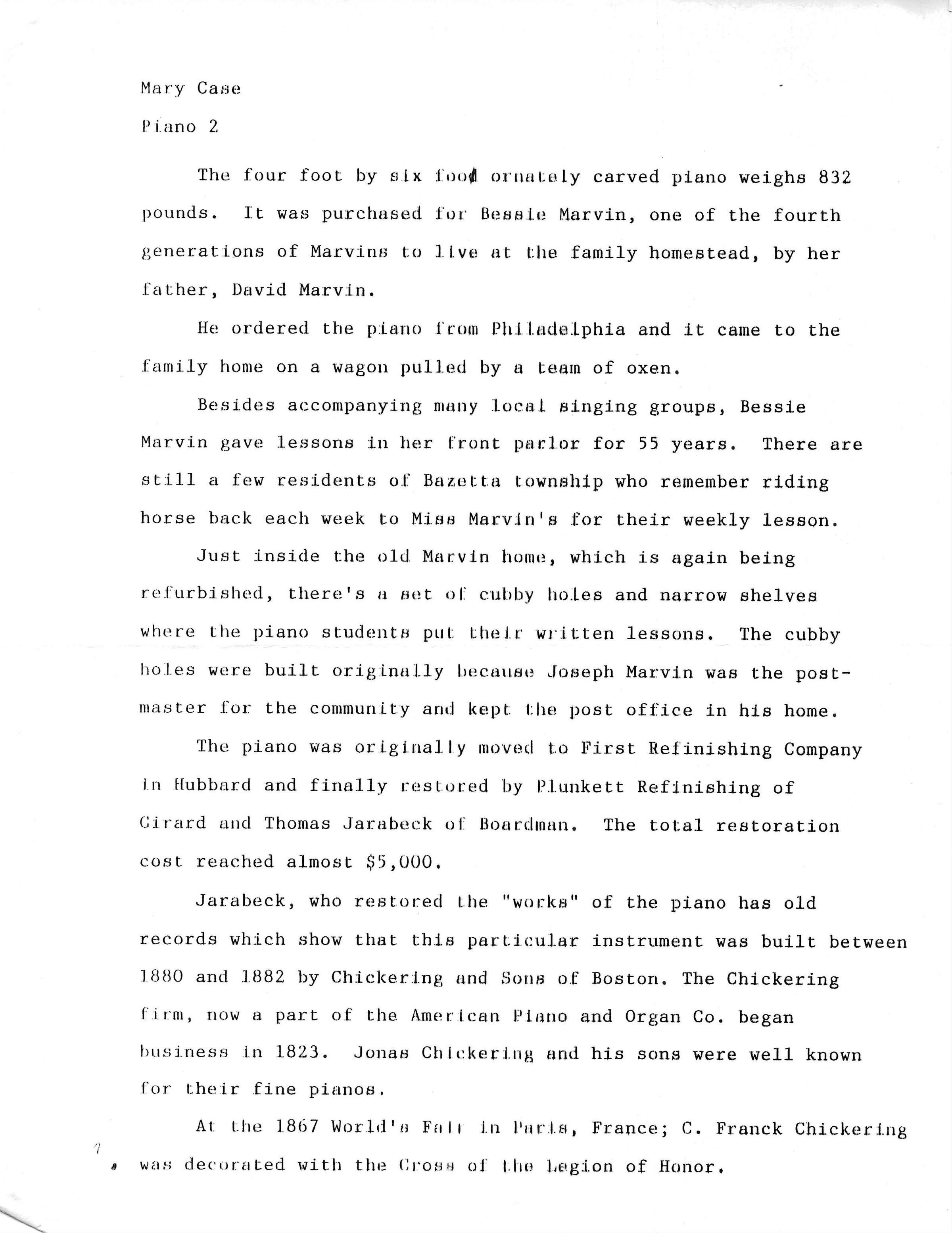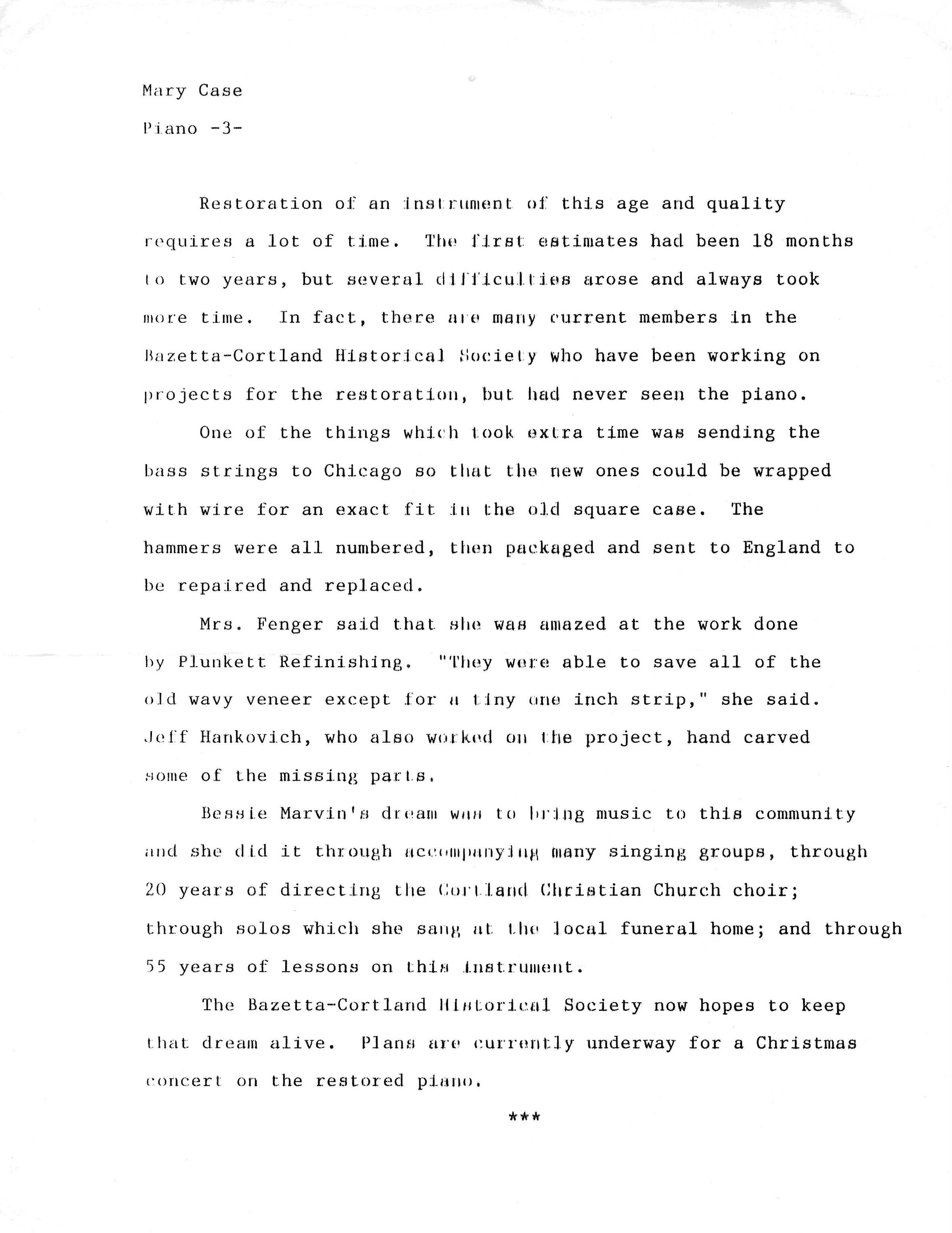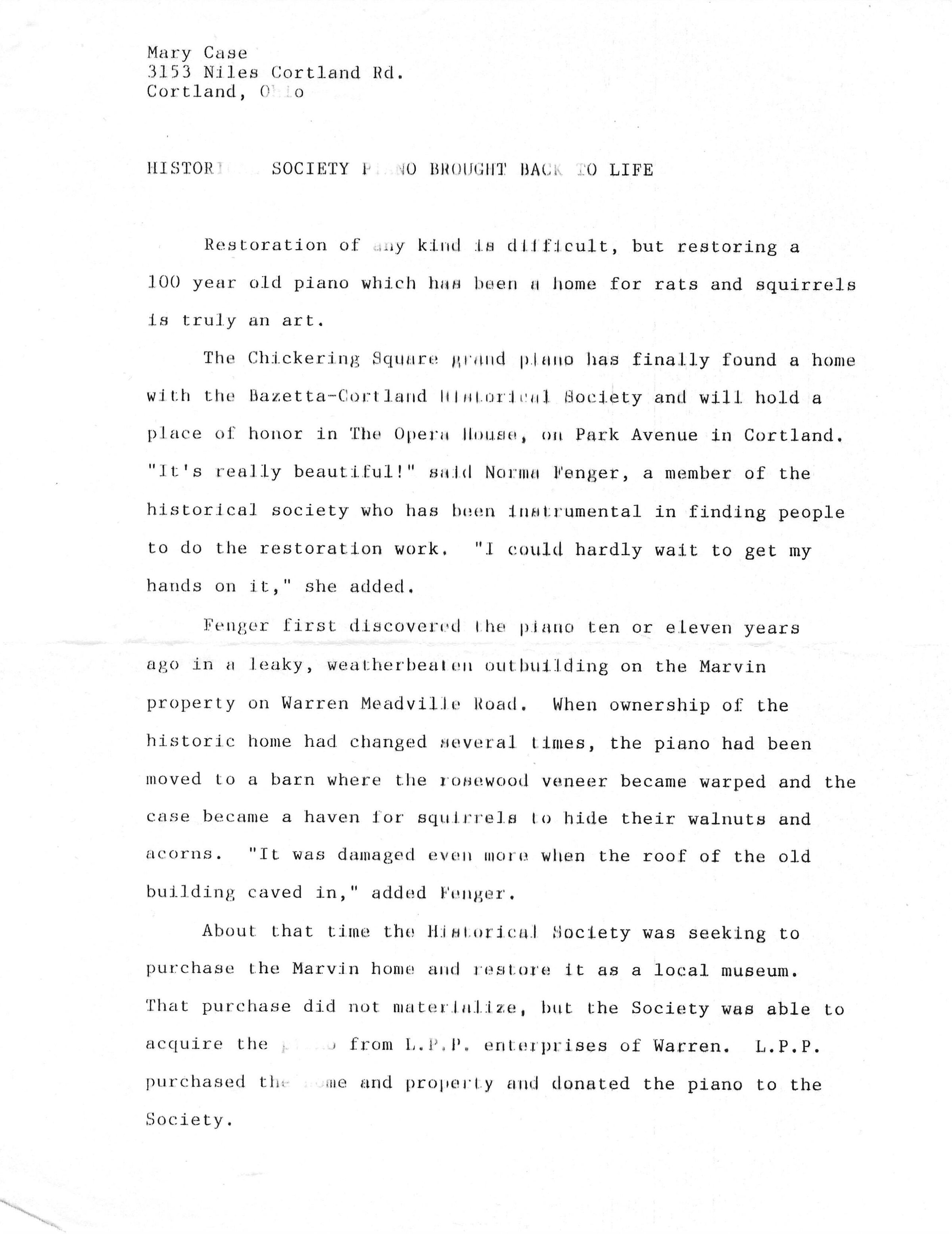 Marvin, Bessie, Marvin, Henry Lee, Cortland Bazetta Historical Society, Fenger, Norma, Marvin, Marvin, David D., Plunkett, Paul, Jarabeck, Thomas, Chickering, C. Frank, Cortland Christian Church, Bazetta Township, Case, Mary, Hankovich, Jeff
