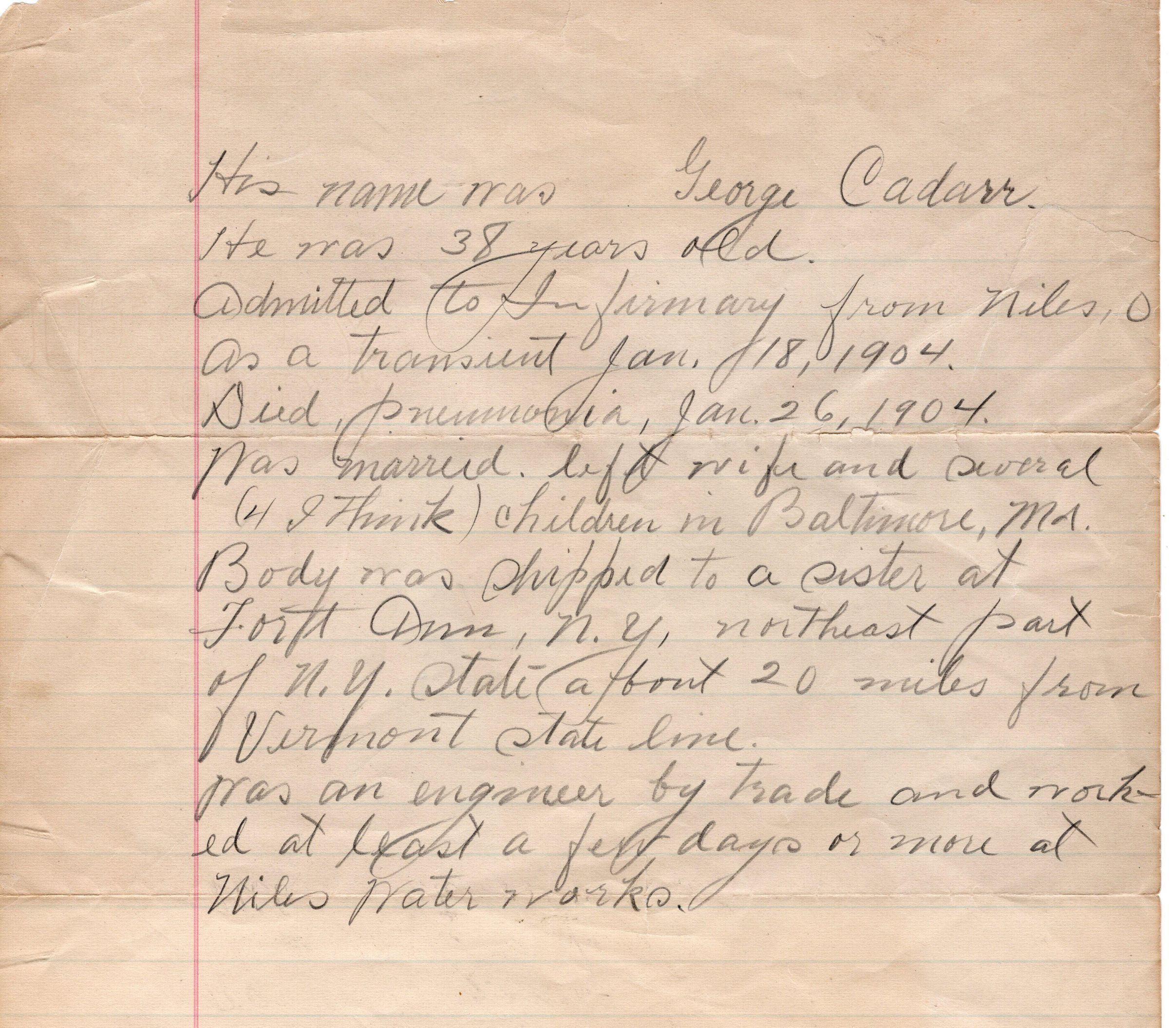 Information about George Cadarr a Transient admitted to the infirmary in January 1904Collection