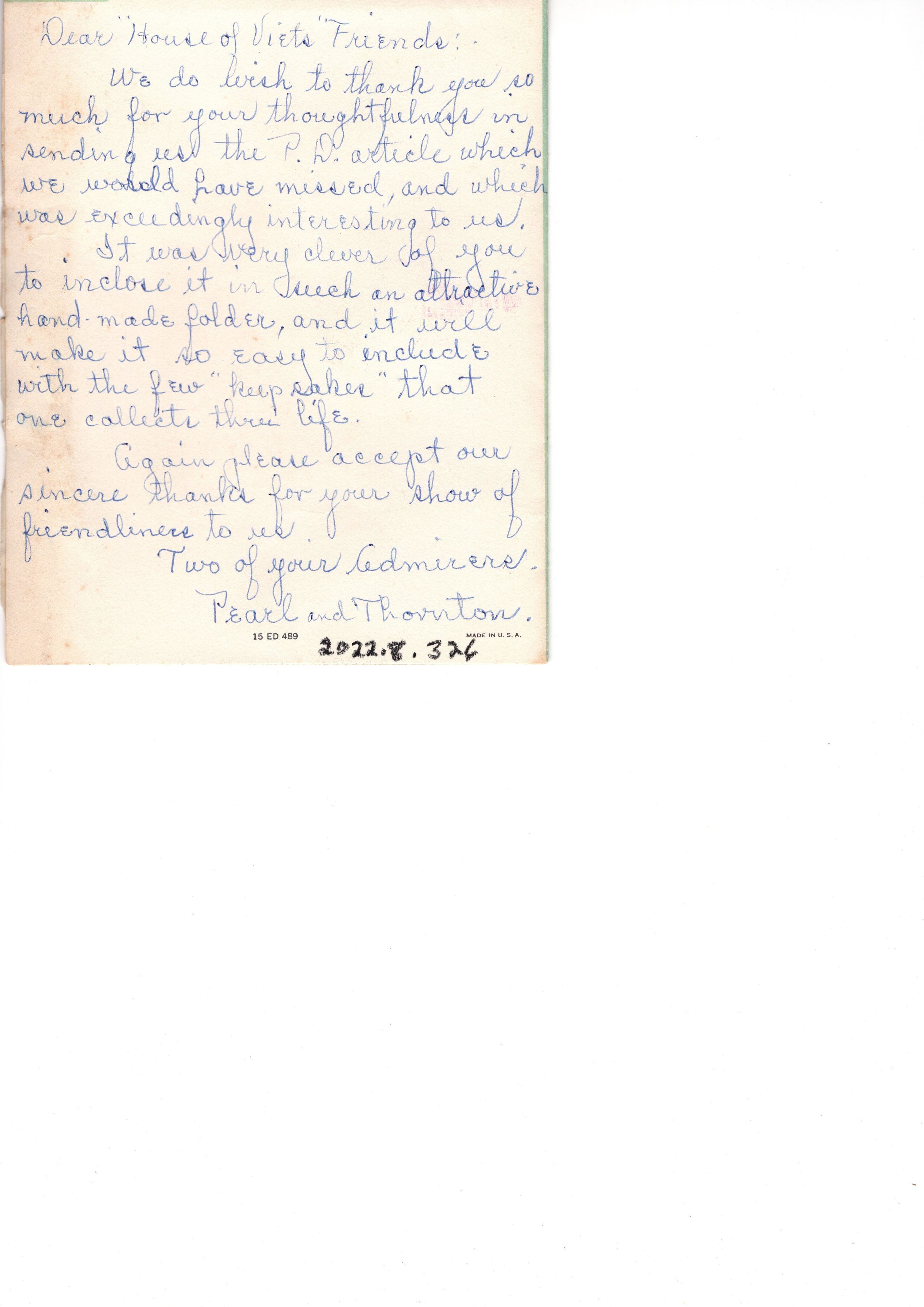Thank you card to the "House of Viets Friends" from Pearl and Thornton regarding an article that the Viets sent to themCollection