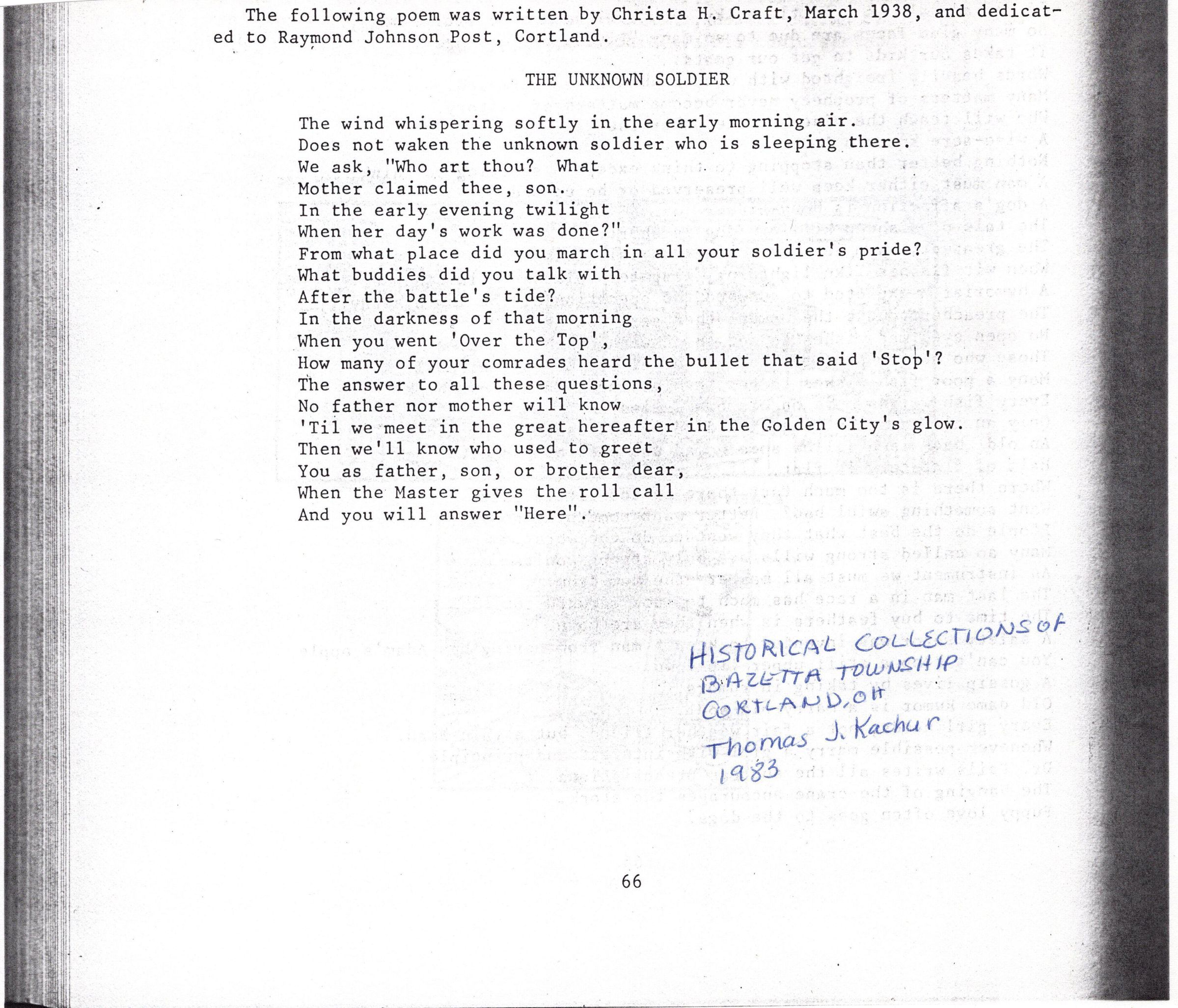 Poem "The Unknown Soldier" by Christa H. Craft March 1938