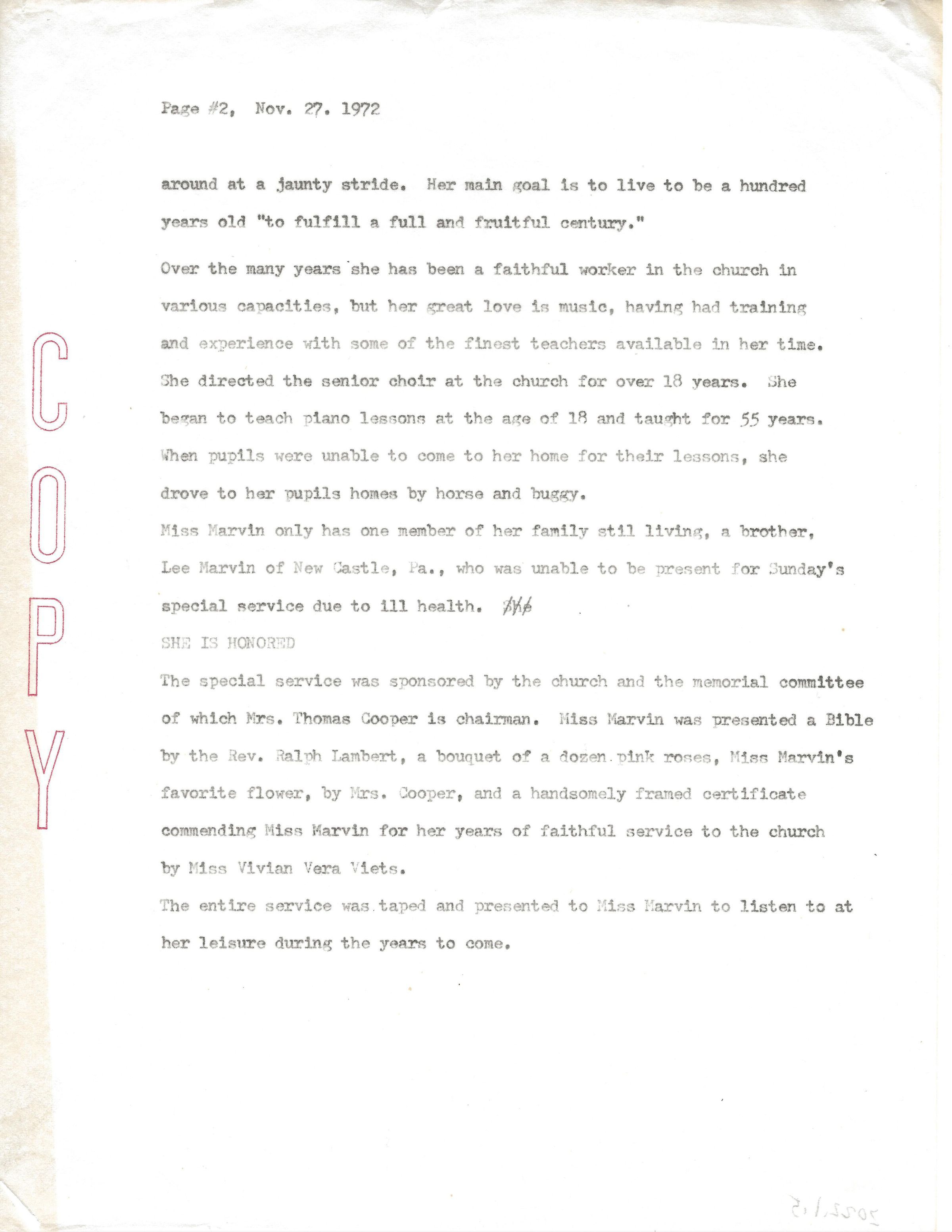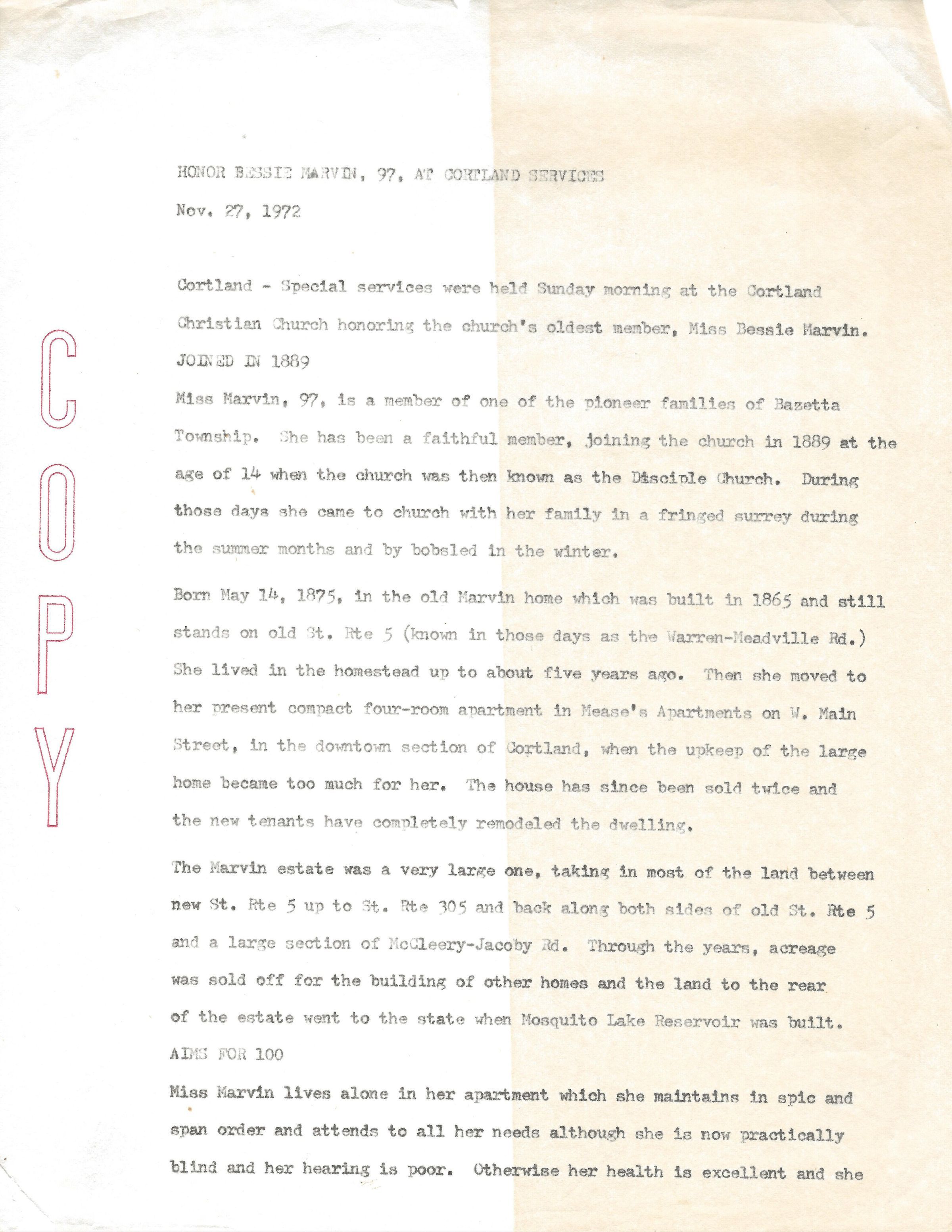 Typed copy of newspaper Article about the celebration of Bessie Marvin's 97th BirthdayCollection