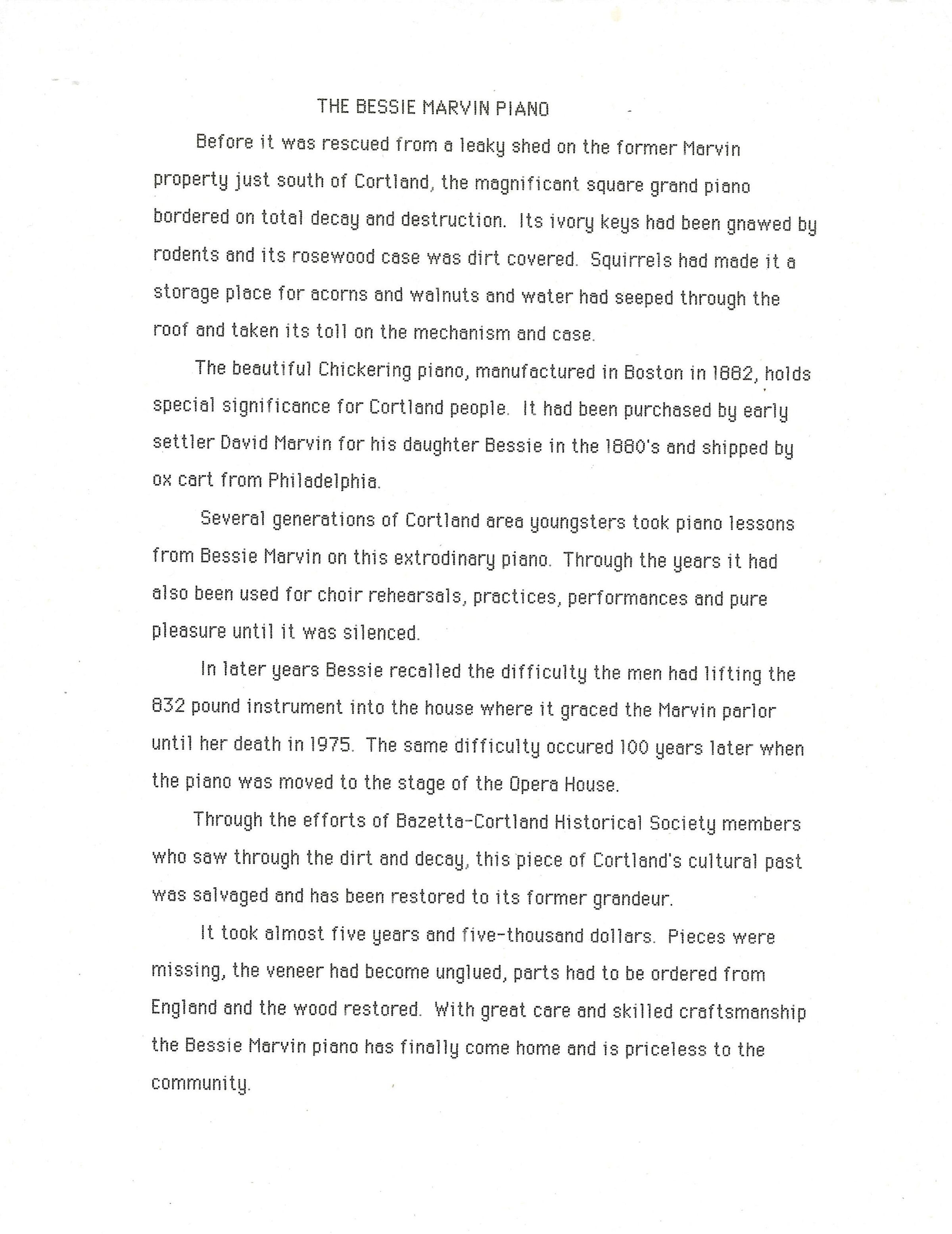Bessie Marvin Piano story, Author unknown, Circa 1988 after restorationCollection