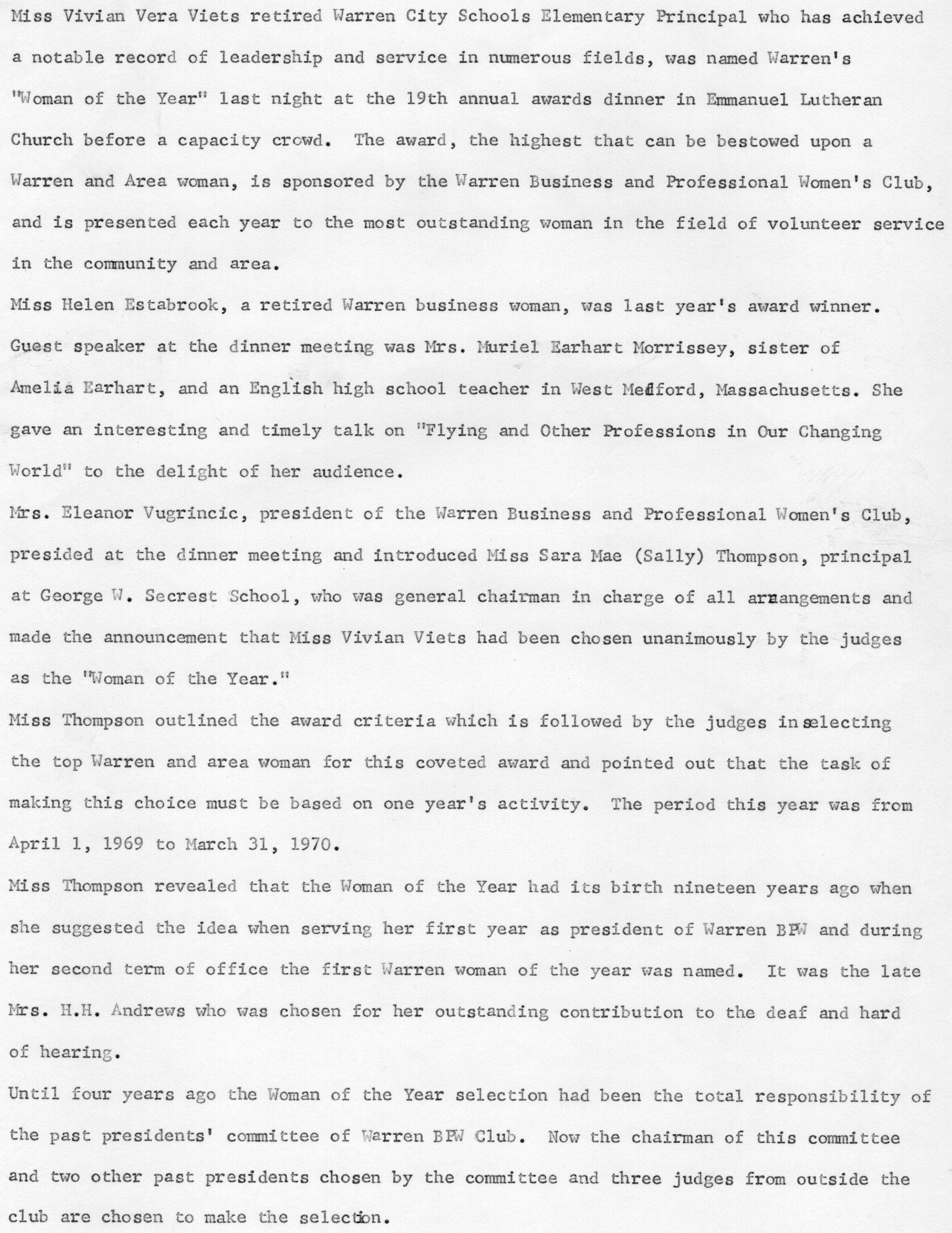 Woman of the Year Recommendation article for Vera VietsEntry/Object ID