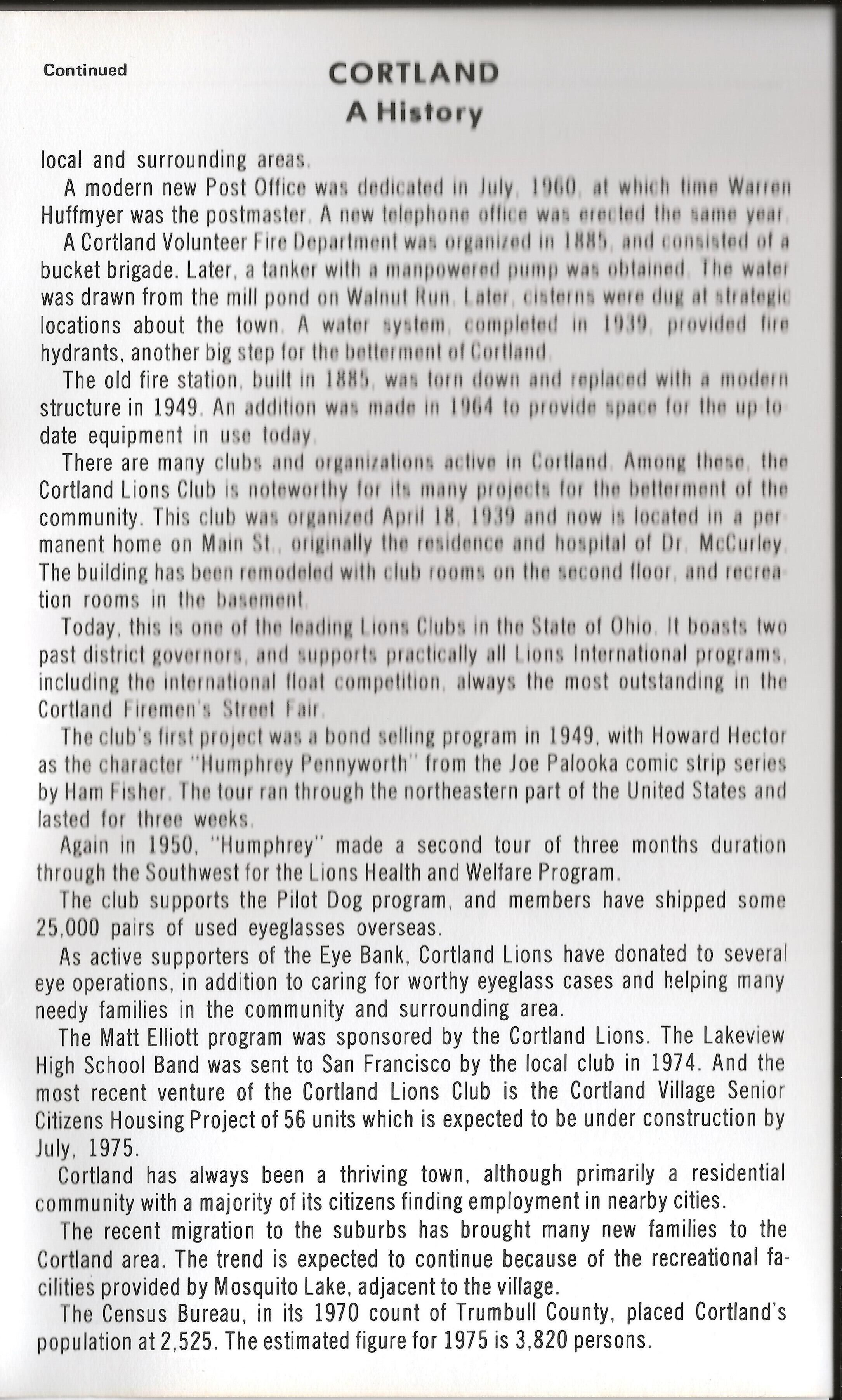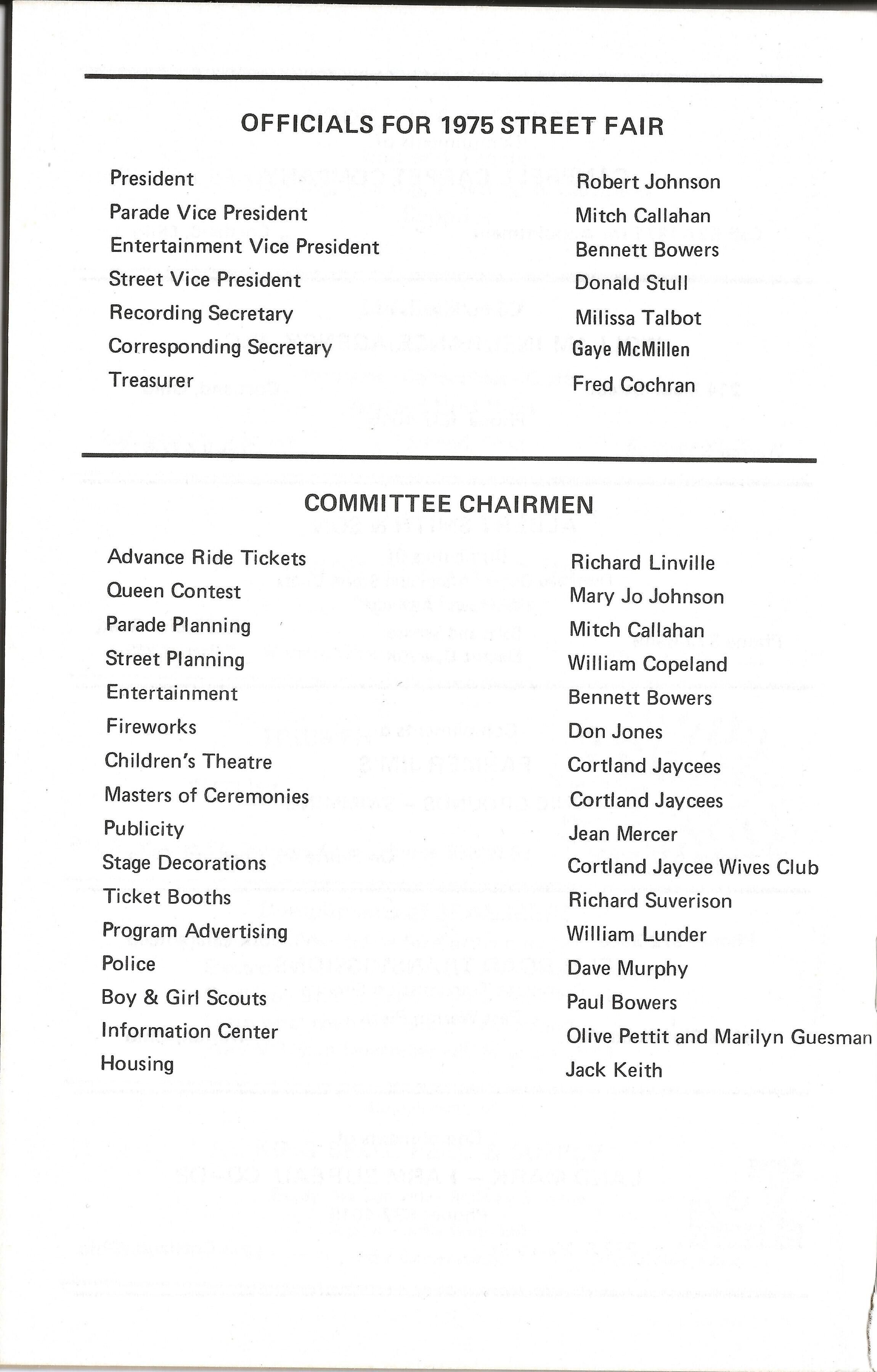 Johnson, Robert, Bowers, Bennett, Callahan, Mitch, Stull, Donald, Talbot, Melissa, Cochran, Fred, Linville, Richard, Johnson, Mary Jo Hall, Jones, Donald, Mercer, Jean, Cortland Jaycees, Suverison, Richard, Lunder, William, Murphy, David H., Bowers, Paul, Keith, Jack, Pettit, Olive, Guesman, Marilyn